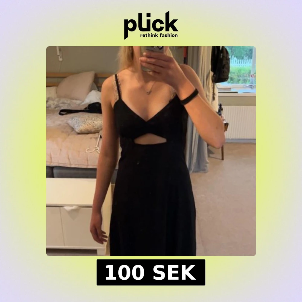 Svart långklänning från BikBok med smala axelband och snygg cut-out detalj under bysten. Klänningen har en figurnära passform upptill och faller rakt ned. Pris är alltid diskuterbart💗