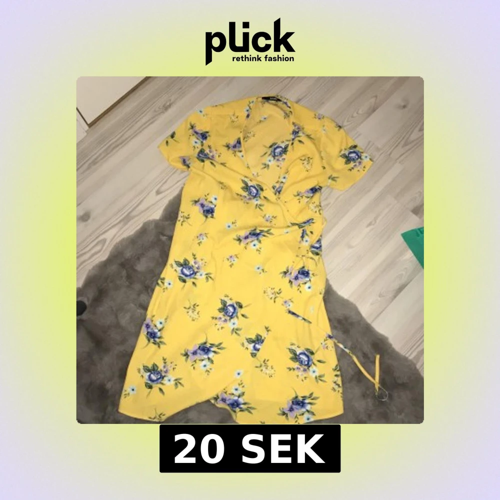 Säljer en söt gul omlottklänning från BikBok med blommigt mönster i blandade färger. Klänningen har korta ärmar och ett knytband i midjan för en fin passform.