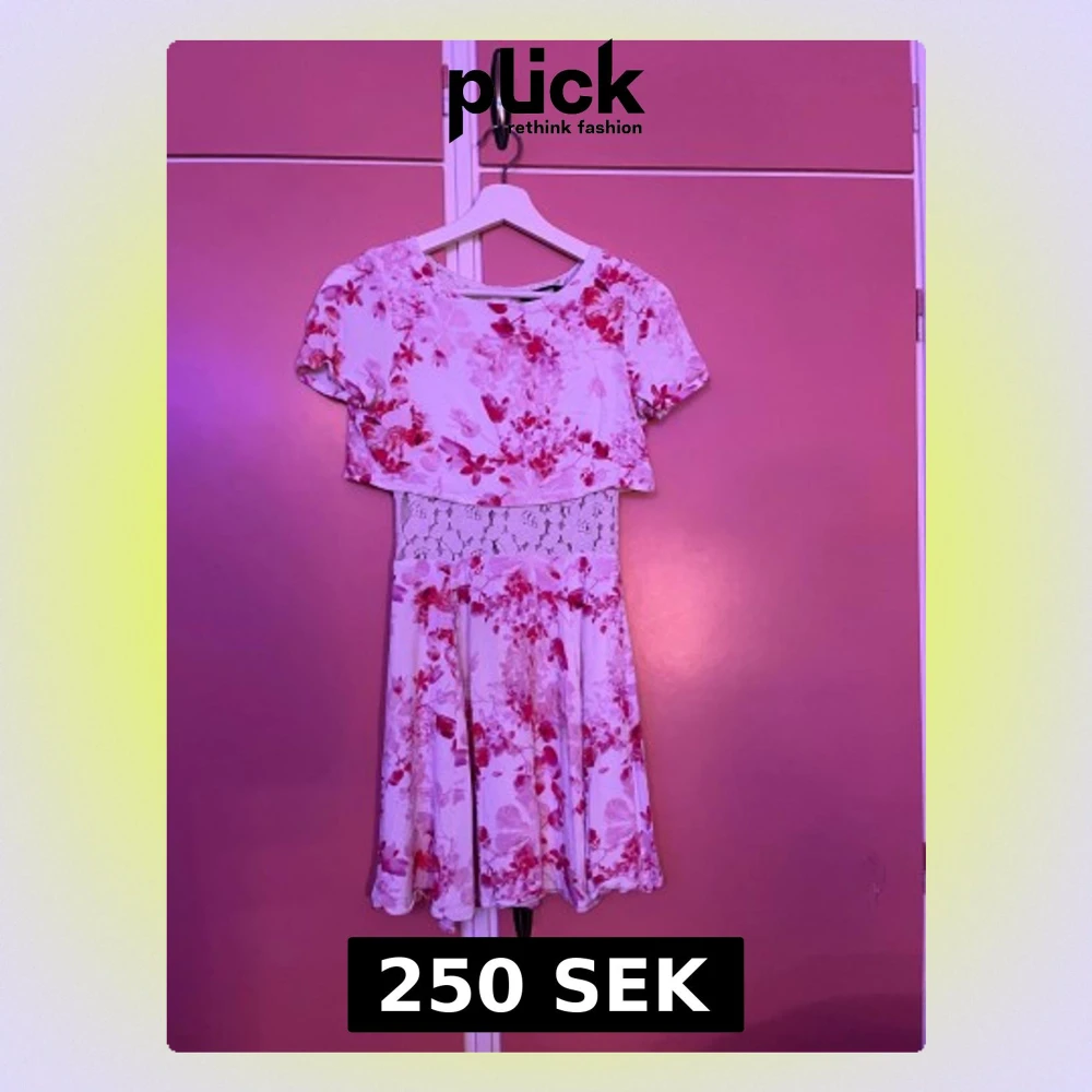 Supersöt kortklänning från BikBok i vitt med rosa och röda blommor. Klänningen har korta ärmar, spetsdetalj i midjan och flowig kjol. Perfekt för sommarens alla tillfällen! Materialet känns lätt och luftigt.