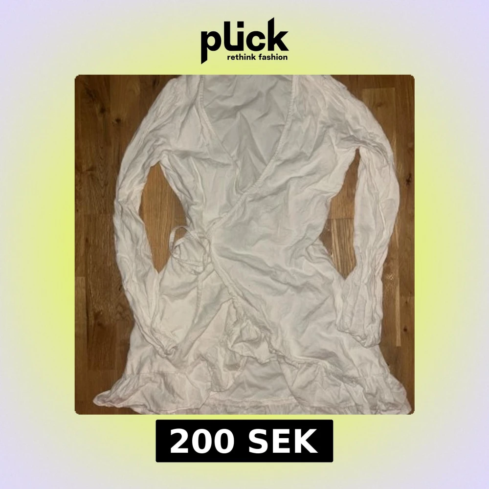 Supersöt vit omlottklänning från Bik Bok i storlek XS. Klänningen har långa ärmar, v-ringad hals och knyt i midjan. Volangdetaljer längst ner ger en extra feminin touch.