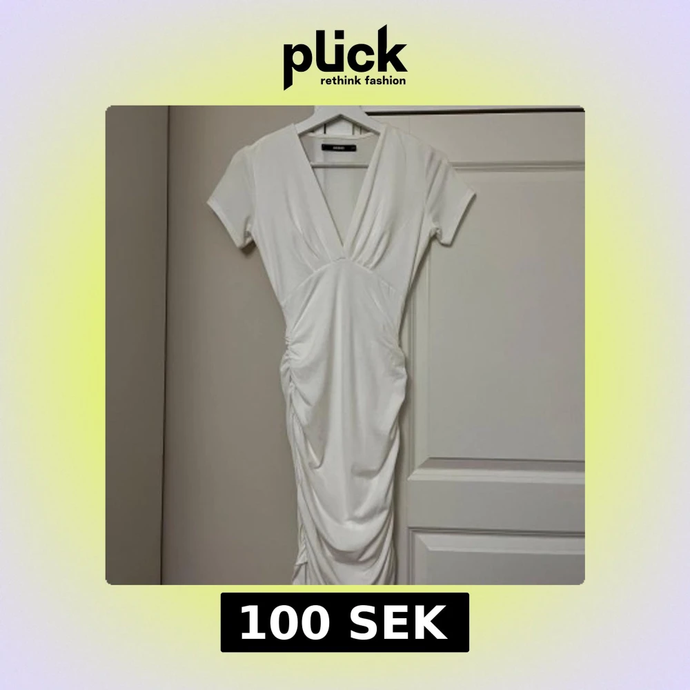 Supersnygg vit klänning från BikBok i omlottmodell med v-ringning och korta ärmar. Klänningen har rynkade detaljer längs sidorna som ger en cool draperad effekt. Perfekt för dig som gillar en stilren look med twist.