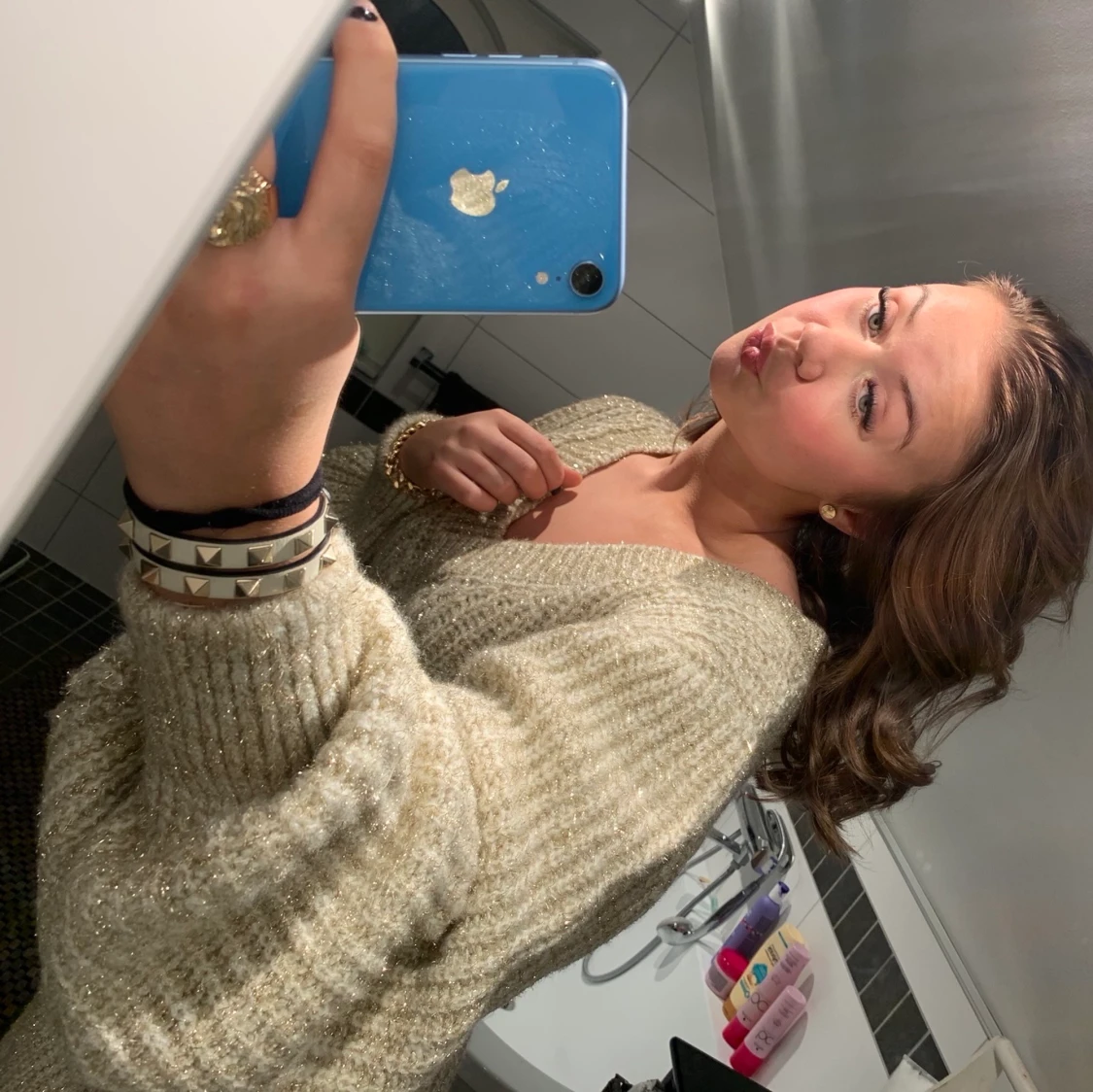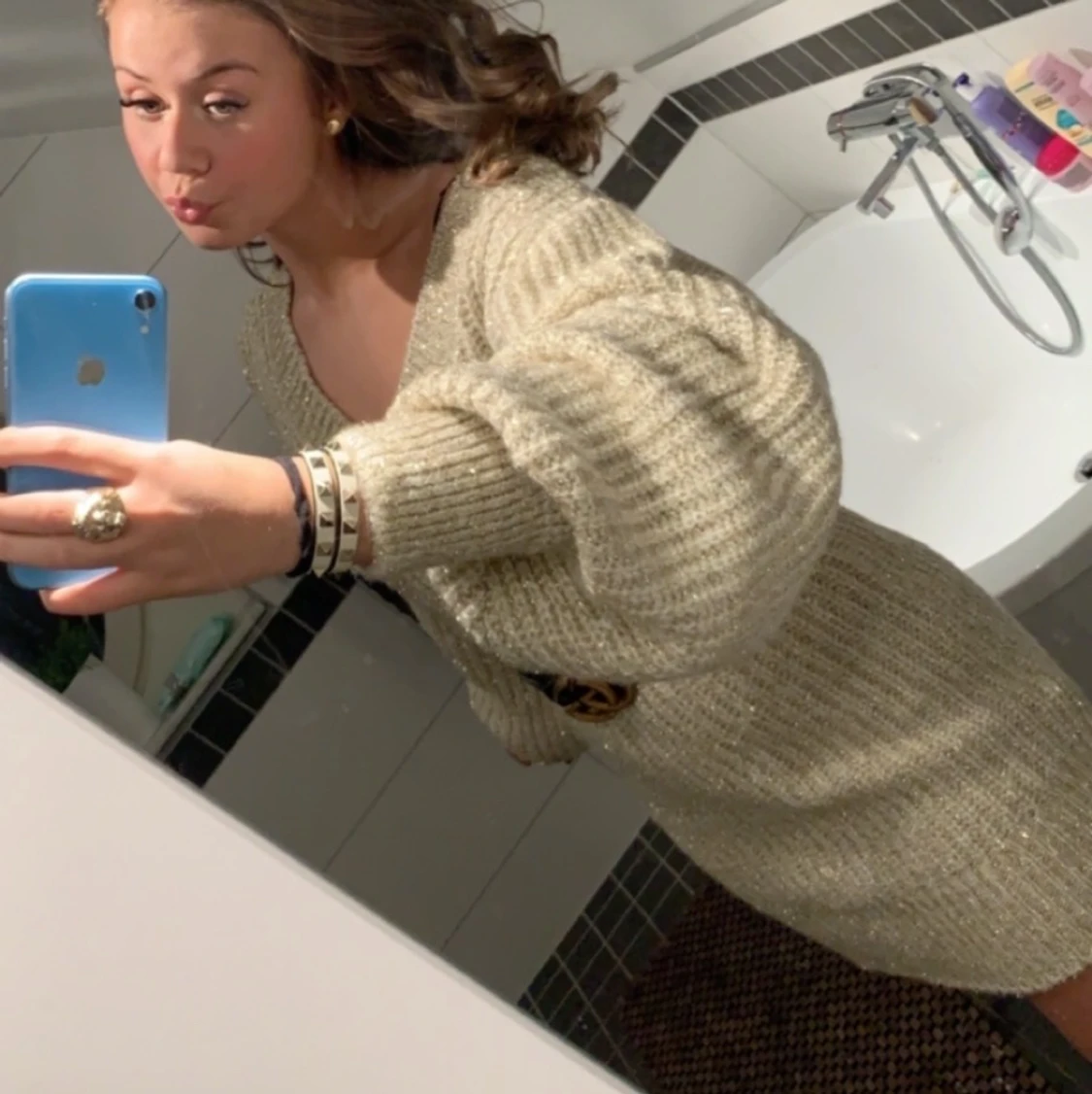 Guld/ champagnefärgad stickad klänning från asos. Finaste och gosigaste klänningen! V-ringning framtill och ballongärmar. Köpt för över 500, säljer för 200kr. Storlek 38 men passar mindre och större beroende på hur man vill den ska sitta ❤️