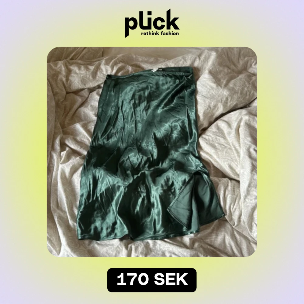Säljer en elegant mörkgrön kjol i siden. kjolen går nedanför knänen och har en slits på sidan som ger en snygg detalj. Perfekt för fest eller andra speciella tillfällen. Den är i nyskick och har en vacker glans som gör att den sticker ut. Passar perfekt för höst och vinter. Kjolen går att stryka fast ut och in i lägre temperaturer (inte strykt på bild)