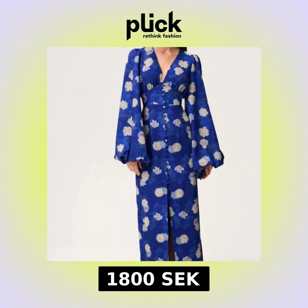 Superfin långklänning i starkt blått med vita och ljusgula blommor. Klänningen har v-ringning, markerad midja, långa puffärmar och knappar framtill. Materialet ser ut att vara lätt och flowy, perfekt för dig som vill sticka ut med en färgglad look. Slutsåld i storleken❤️liten u storleken❤️