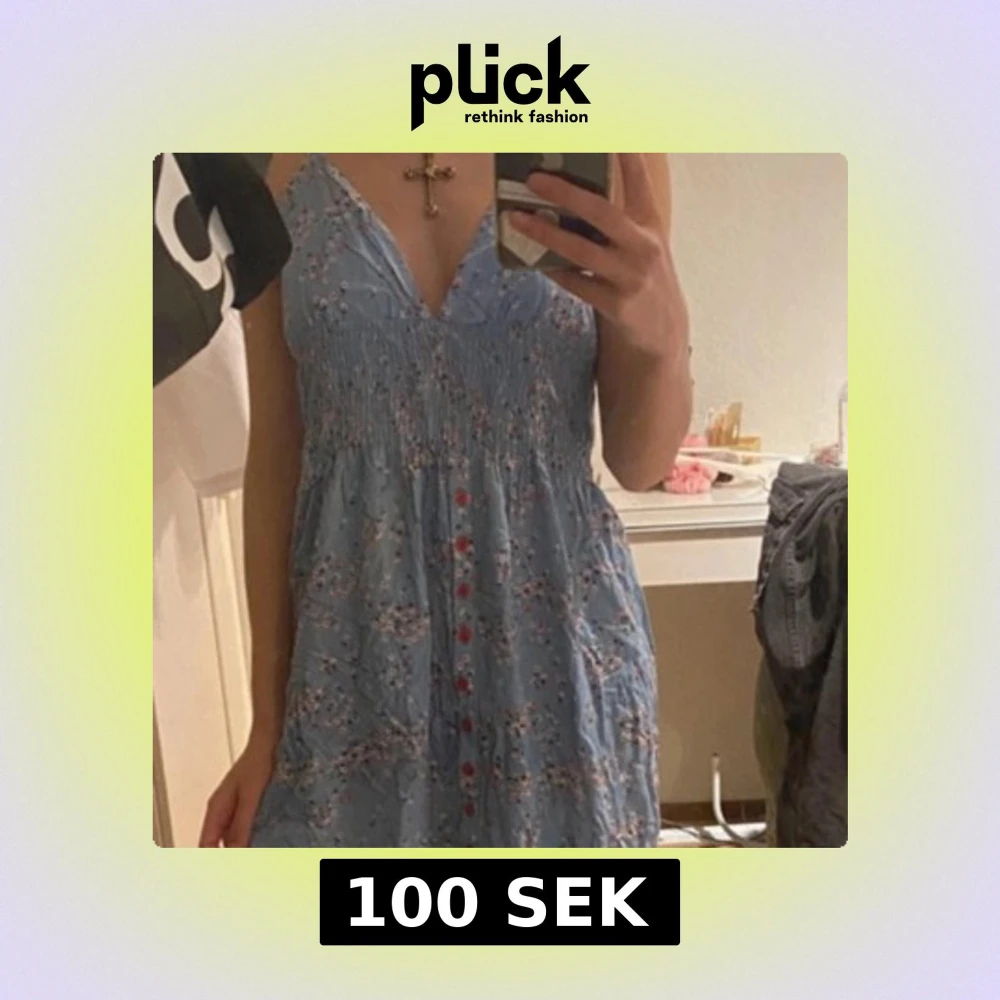 Söt blå klänning med blommigt mönster och röda knappar. Klänningen har en v-ringad design och knytband i nacken, vilket ger en öppen rygg. .