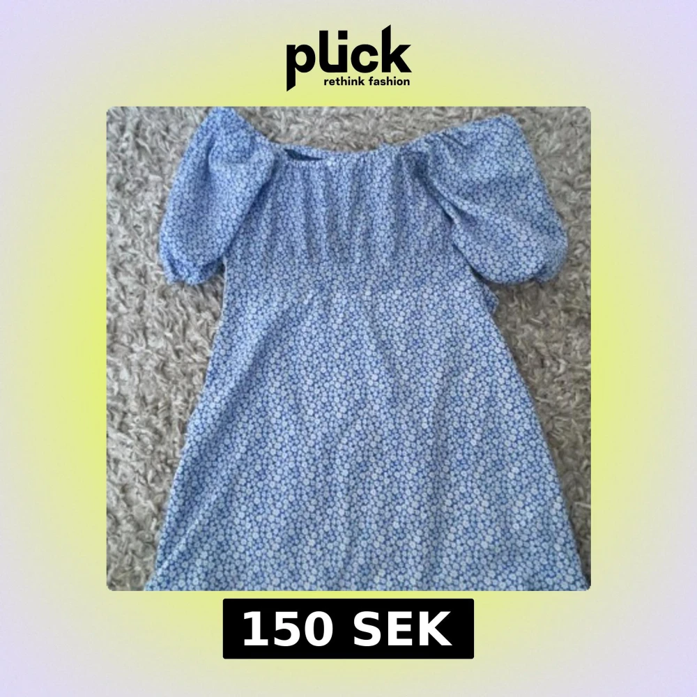 Kom privat för mer bilder, Charmig blå klänning med blommigt mönster och puffiga kortärmar. Perfekt för en somrig look med sin offshoulder-design.