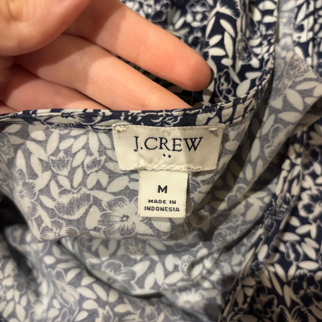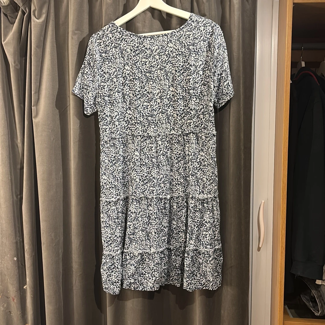 Säljer en söt blå klänning från J.Crew med ett vitt blommönster. Klänningen har korta ärmar och en v-ringad hals. Perfekt för en avslappnad dag ute. Skriv gärna om eventuella frågor.🌸