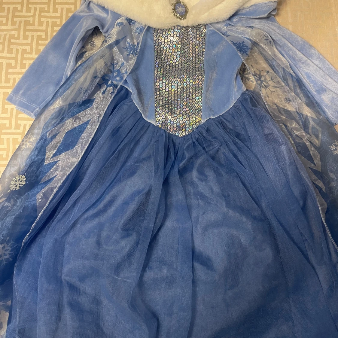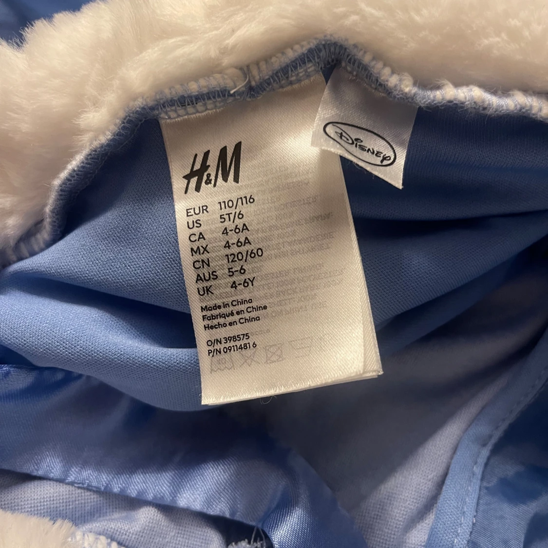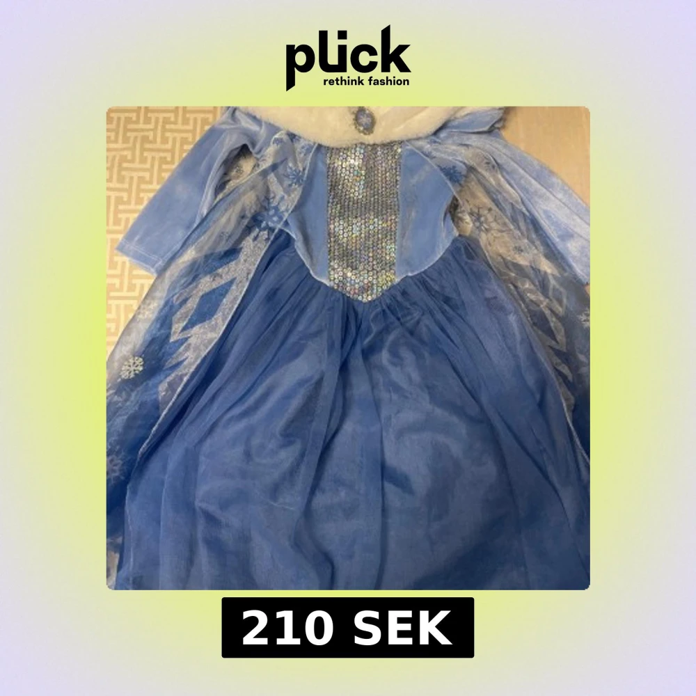 Säljer en magisk blå Frozen-klänning från H&M i samarbete med Disney, storlek 110/116. Klänningen har glittriga paljetter framtill, långärmade ärmar och ett fluffigt vitt fuskpäls vid halsen. Tyllkjol och transparent cape med snöflingemönster ger en riktig prinsesskänsla.