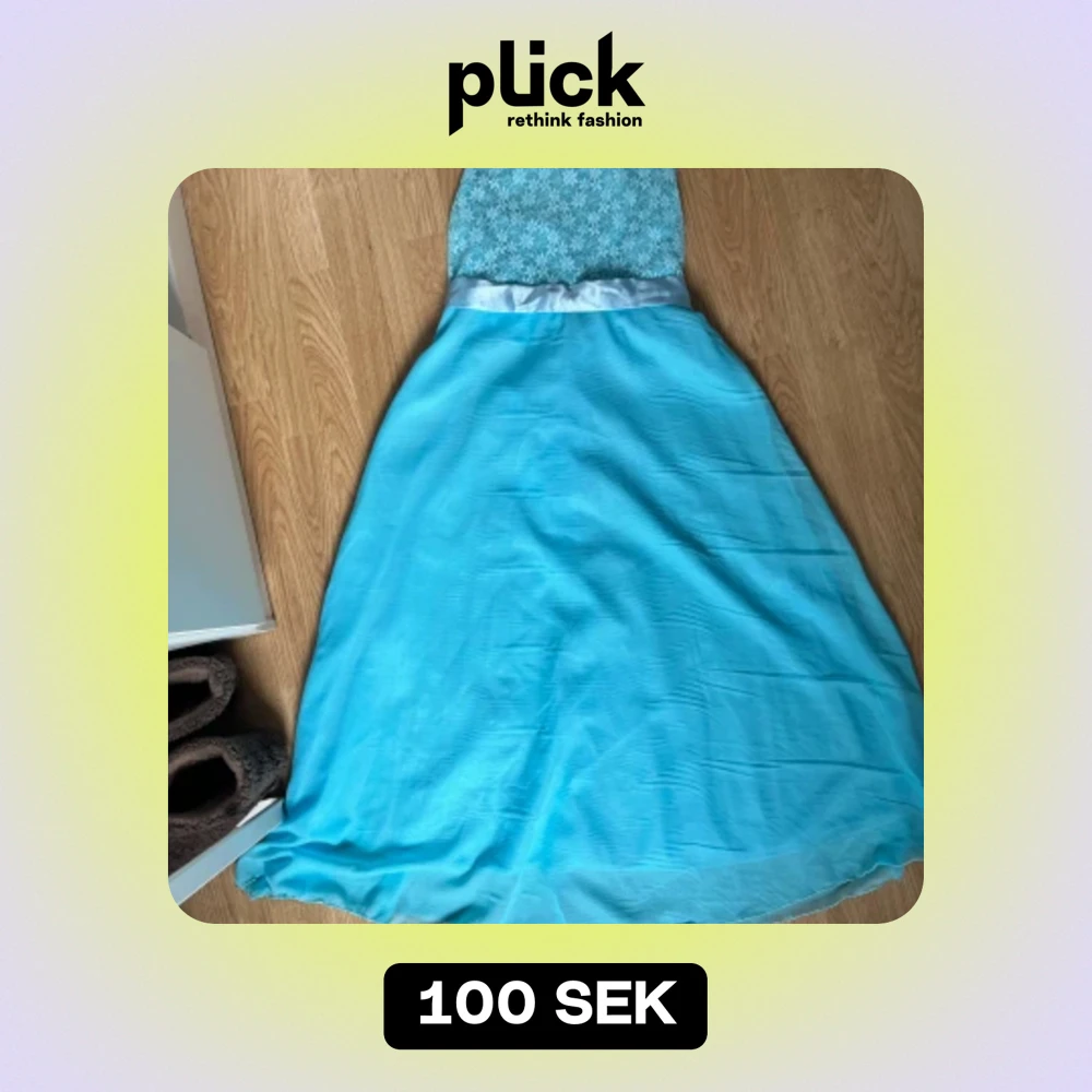 Blå klänning som blivit använd en gång under en skolavslutning. Spets överdel med band som man antingen knyter fram eller bak. Kan ge mera specifika mått till den som vill!