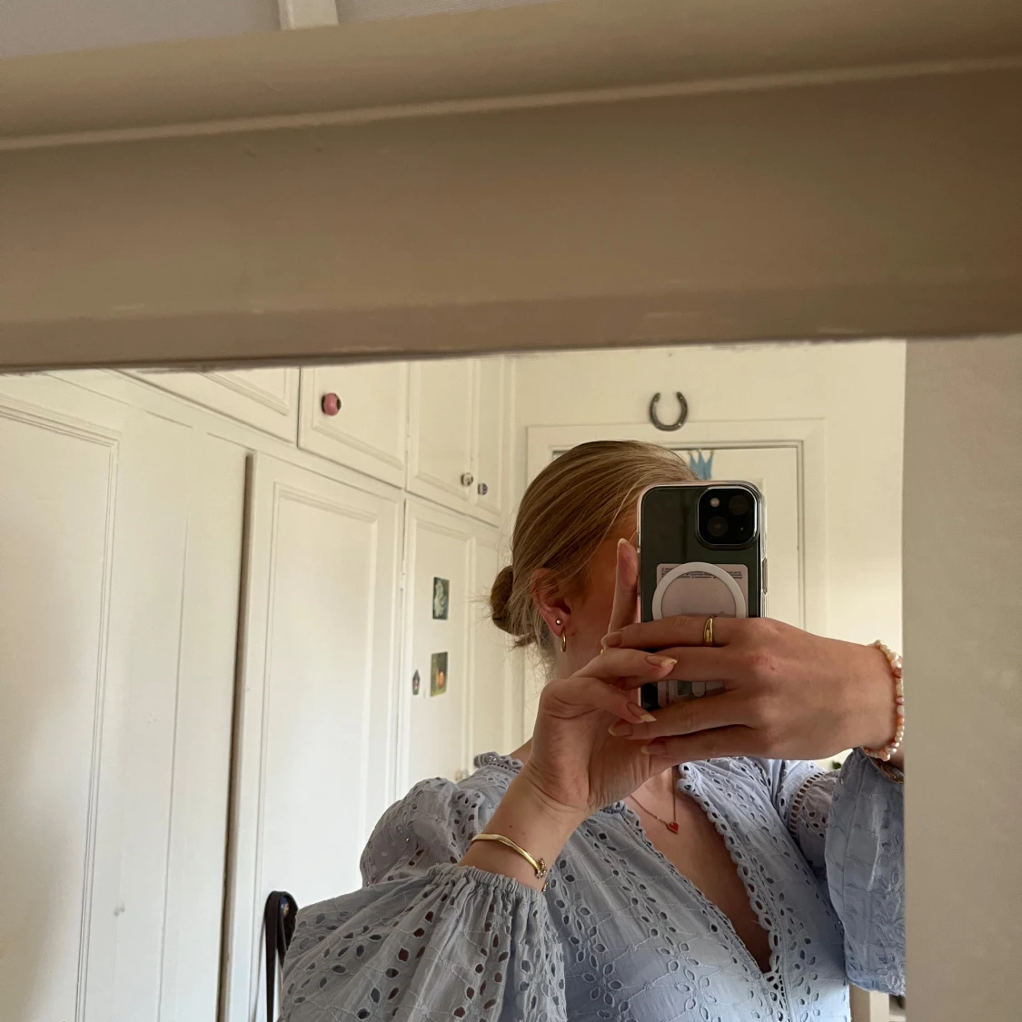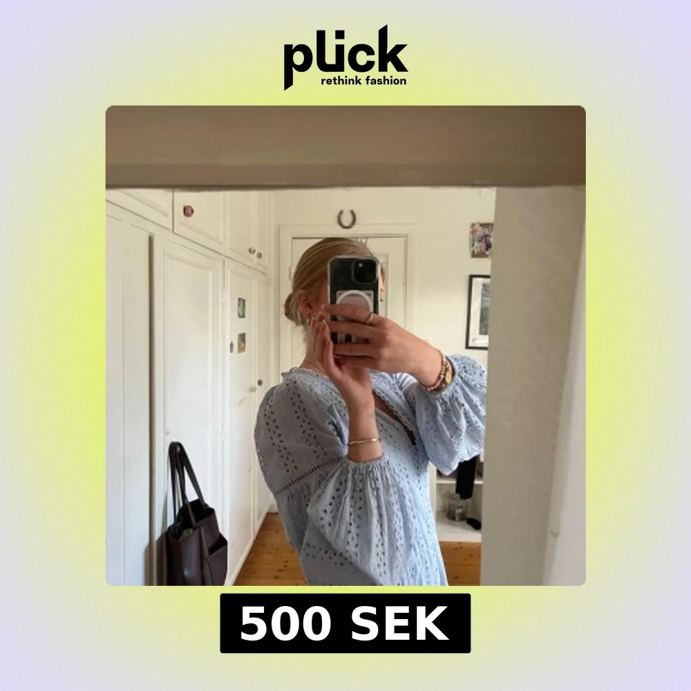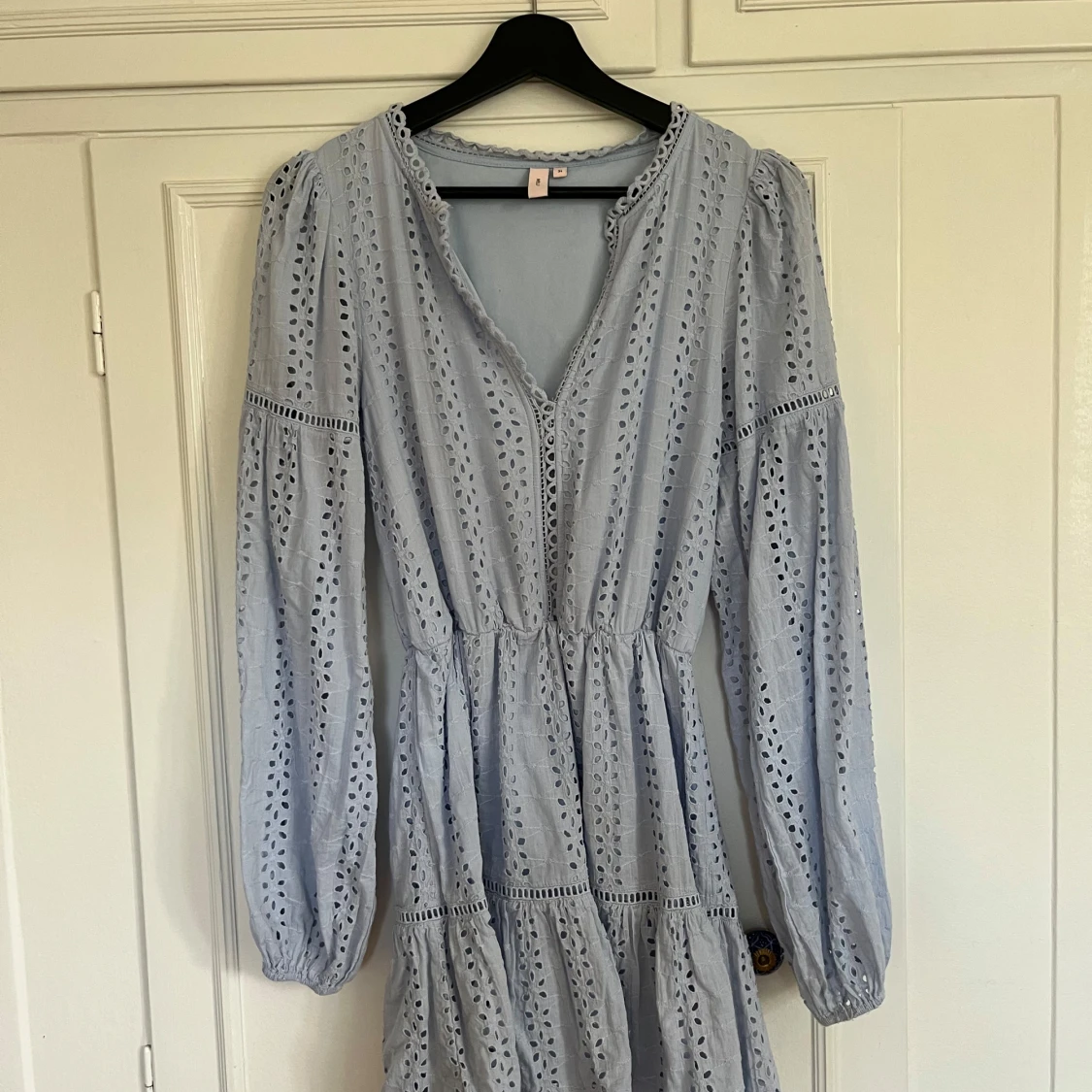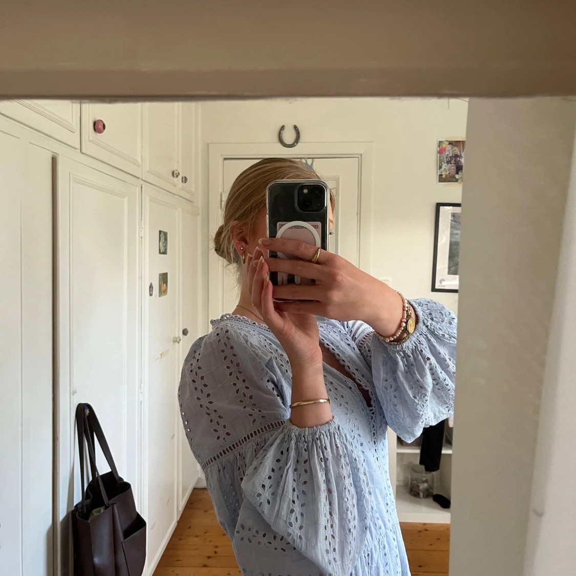 Superfin ljusblå klänning från Gina Tricot med broderade detaljer och v-ringning. Slutsåld och finns inte längre på hemsidan. Långärmade puffärmar med resår vid handlederna. Helt ny, aldrig använd, som ny kostade den 600kr❣️