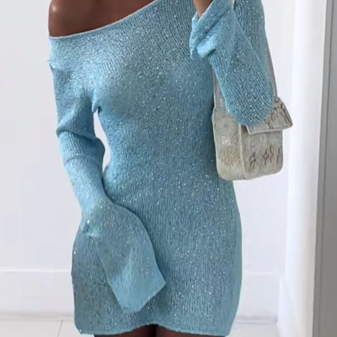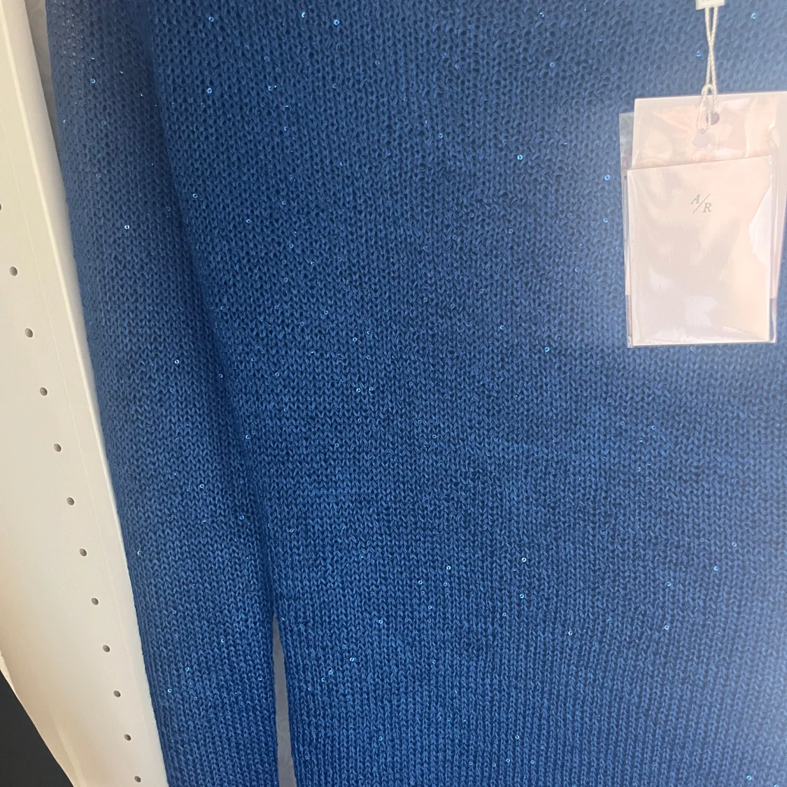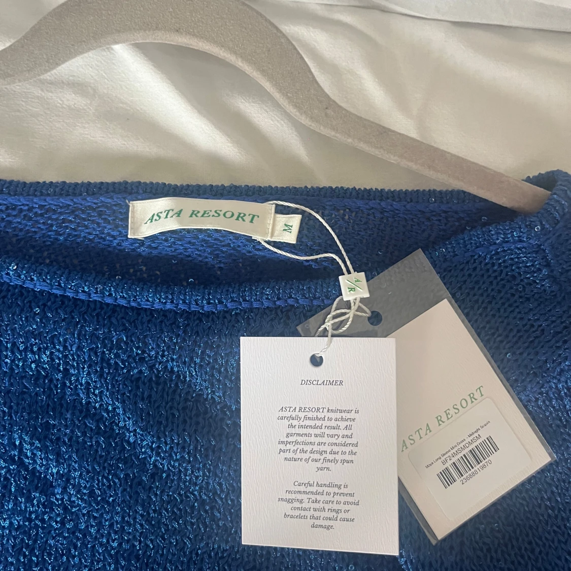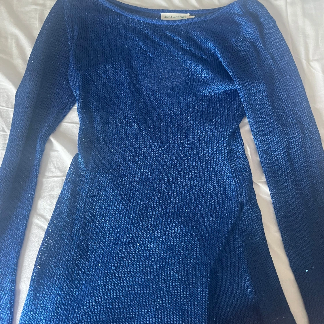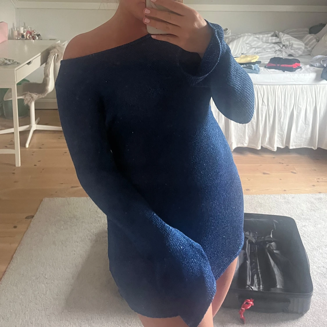 Säljer denna jättesnygga mörkblå klänning från Asta Resort i storlek M. Klänningen är helt oanvänd och har prislappen kvar. Köpte klänningen för 3000kr. Materialet är stickat med små glittriga detaljer som syns bättre i ljuset!💙