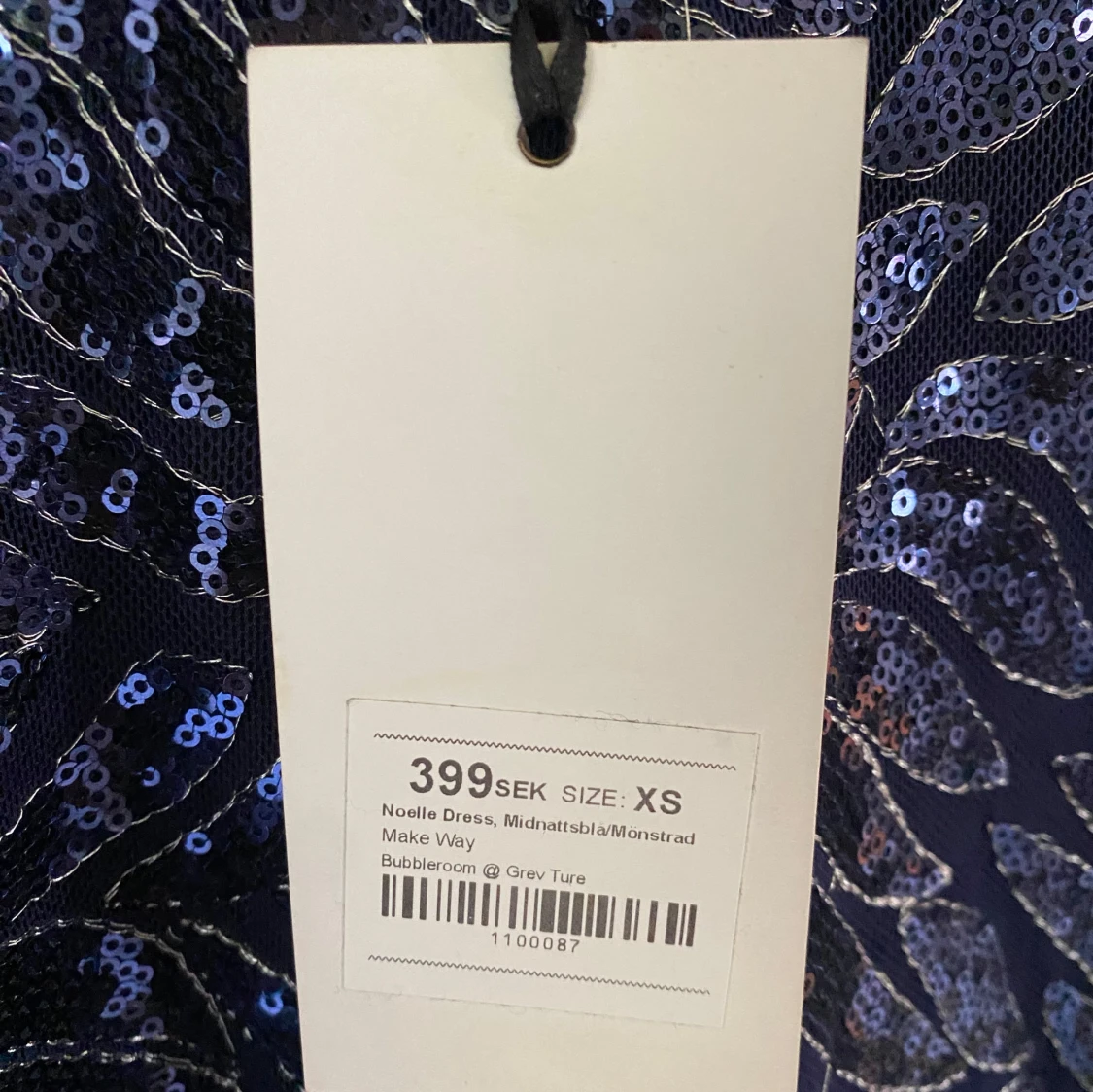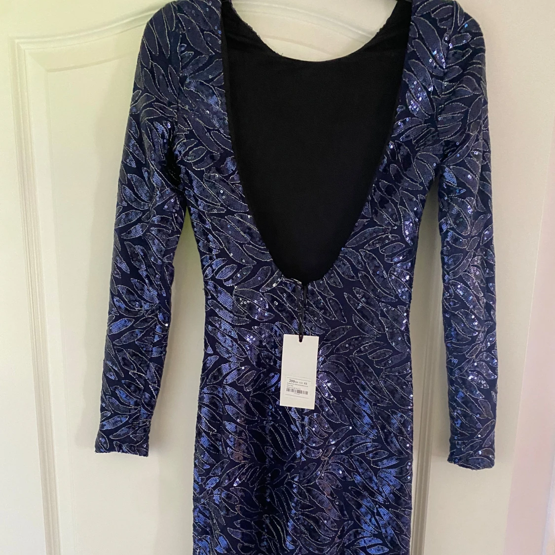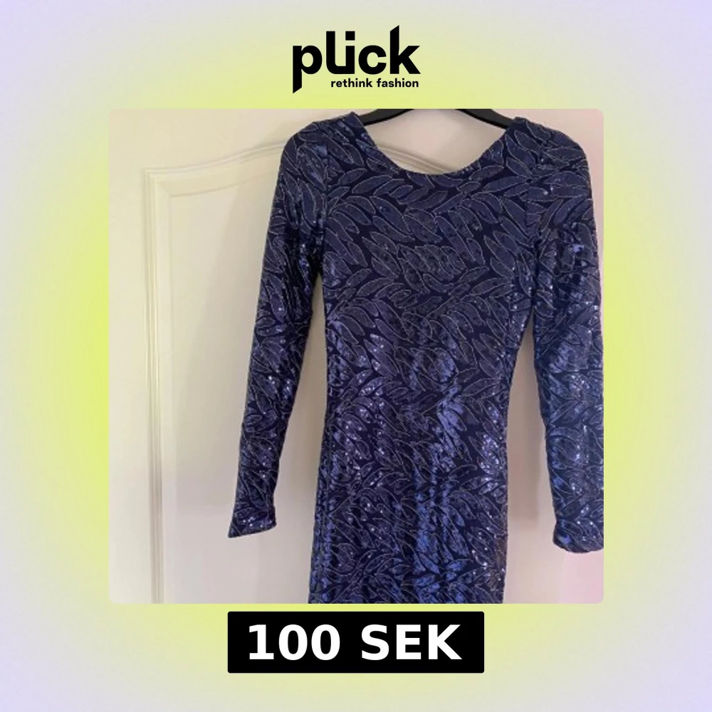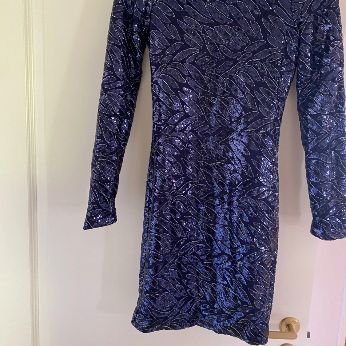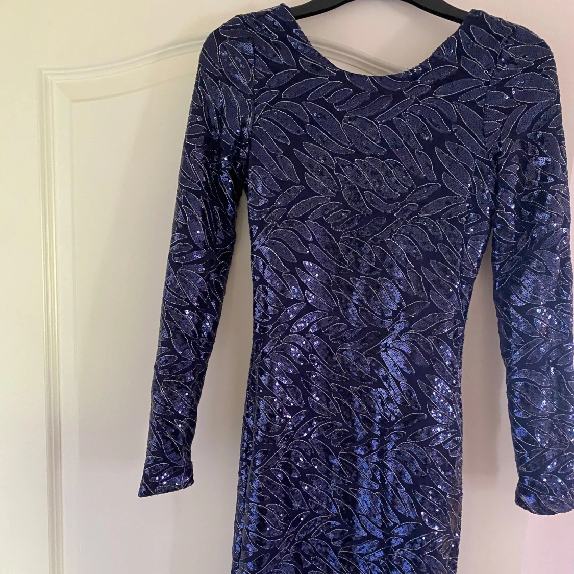 Säljer en blå glittrig klänning från Make Way med lång ärm och djup rygg. Klänningen har ett vackert mönster av paljetter i bladform och är figurnära. Perfekt för dig som vill sticka ut med stil. Ordinarie pris för klänningen är 399kr men säljer den för mycket billigare. Klänningen har även prislappen kvar.