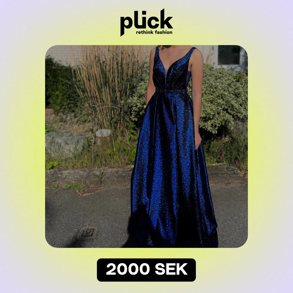Säljer en fantastisk blå glittrig långklänning perfekt för fest eller nyår. Klänningen har en djup v-ringning och är ärmlös. Materialet är glittrande och fångar ljuset vackert!