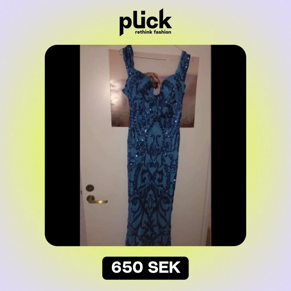 Säljer en fantastisk blå långklänning med glittriga paljetter och ett vackert mönster. Klänningen har en djup v-ringning och är ärmlös, perfekt för festliga tillfällen. Den är figurnära och elegant, vilket gör den idealisk för nyår eller bal.