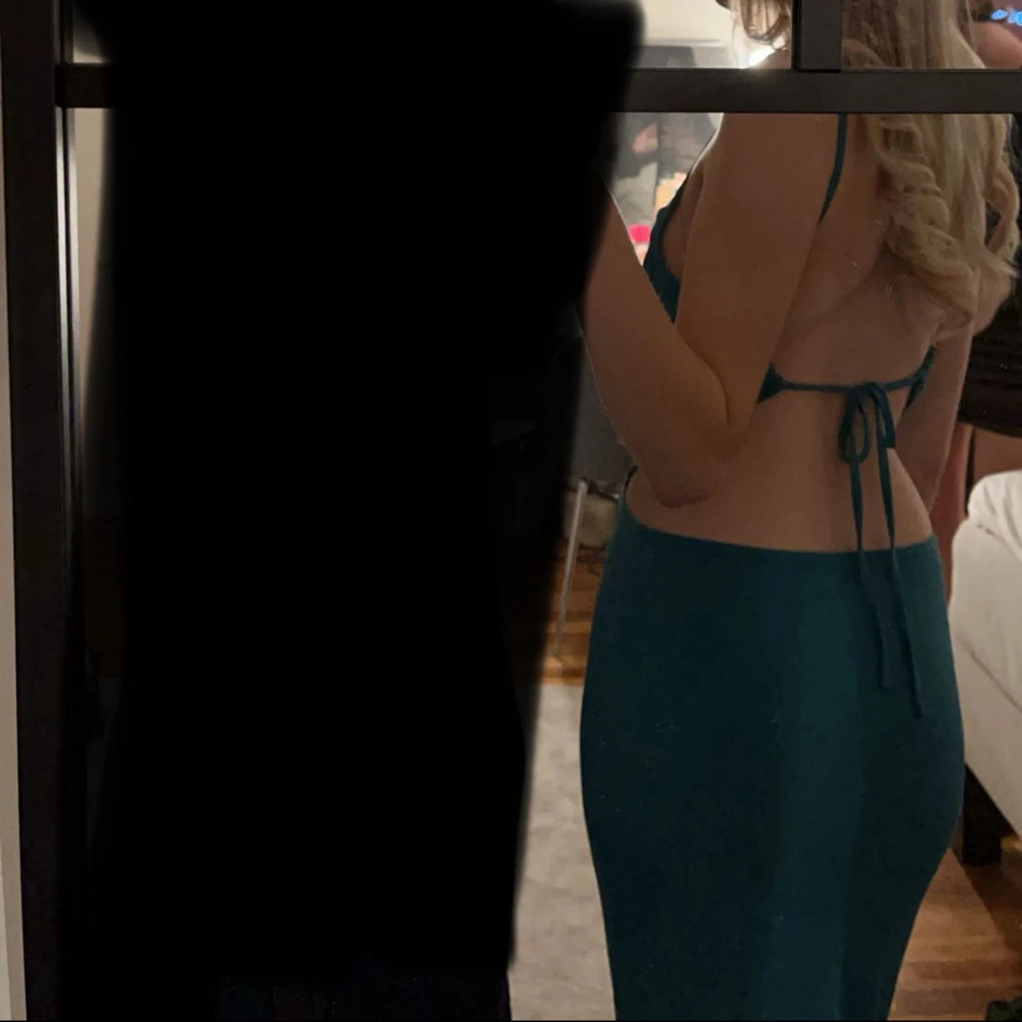 Säljer en snygg blå/grön långklänning med smala axelband och öppen rygg med knyt. Klänningen är i storlek xs. Skriv om du har frågor💕