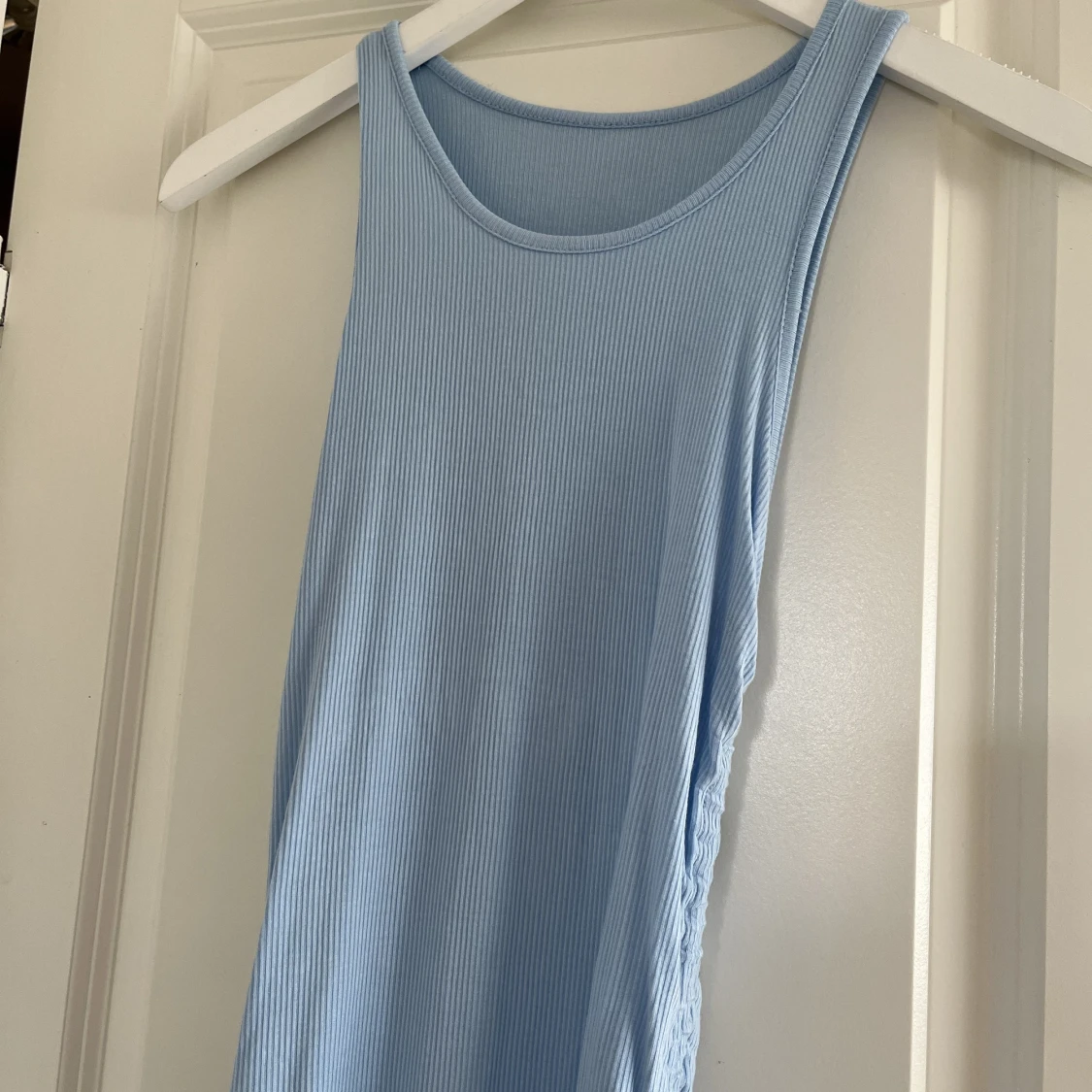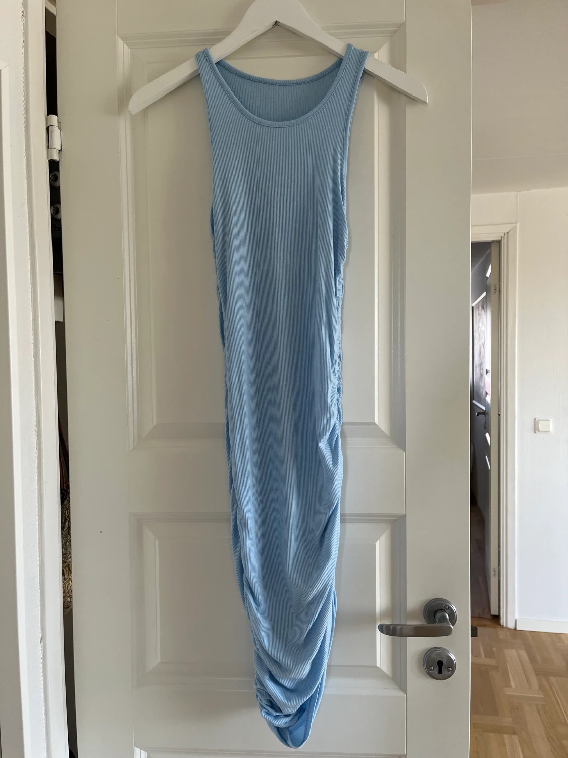 En ljusblå härligt klänning!! Lappen av så vet dessvärre inte märke eller storlek men sitter som en S/Xs, justerbar längd!