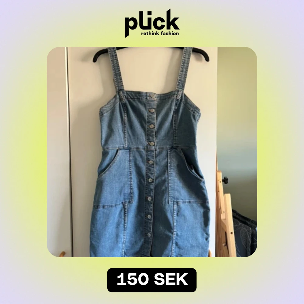 Denim miniklänning från HM, hyfsat stretchig, justerbara axelband och knappar som går att öppna på framsidan. Har även två fram fickor. Använd bara några fåtal gånger och har inga defekter. Stl XL Hör av dig om du har några frågor!