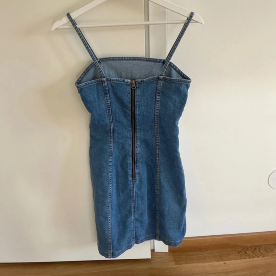 En blå jeans klänning med dragkedja i strl Xs (men passar som en S då den är väldigt stretchig). Knappt använd och mycket bra skick!