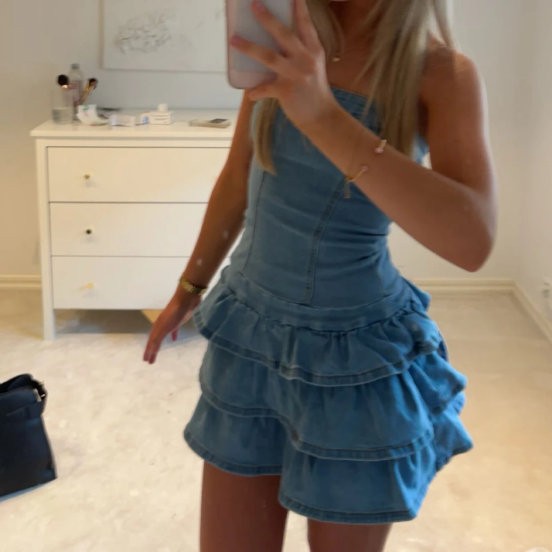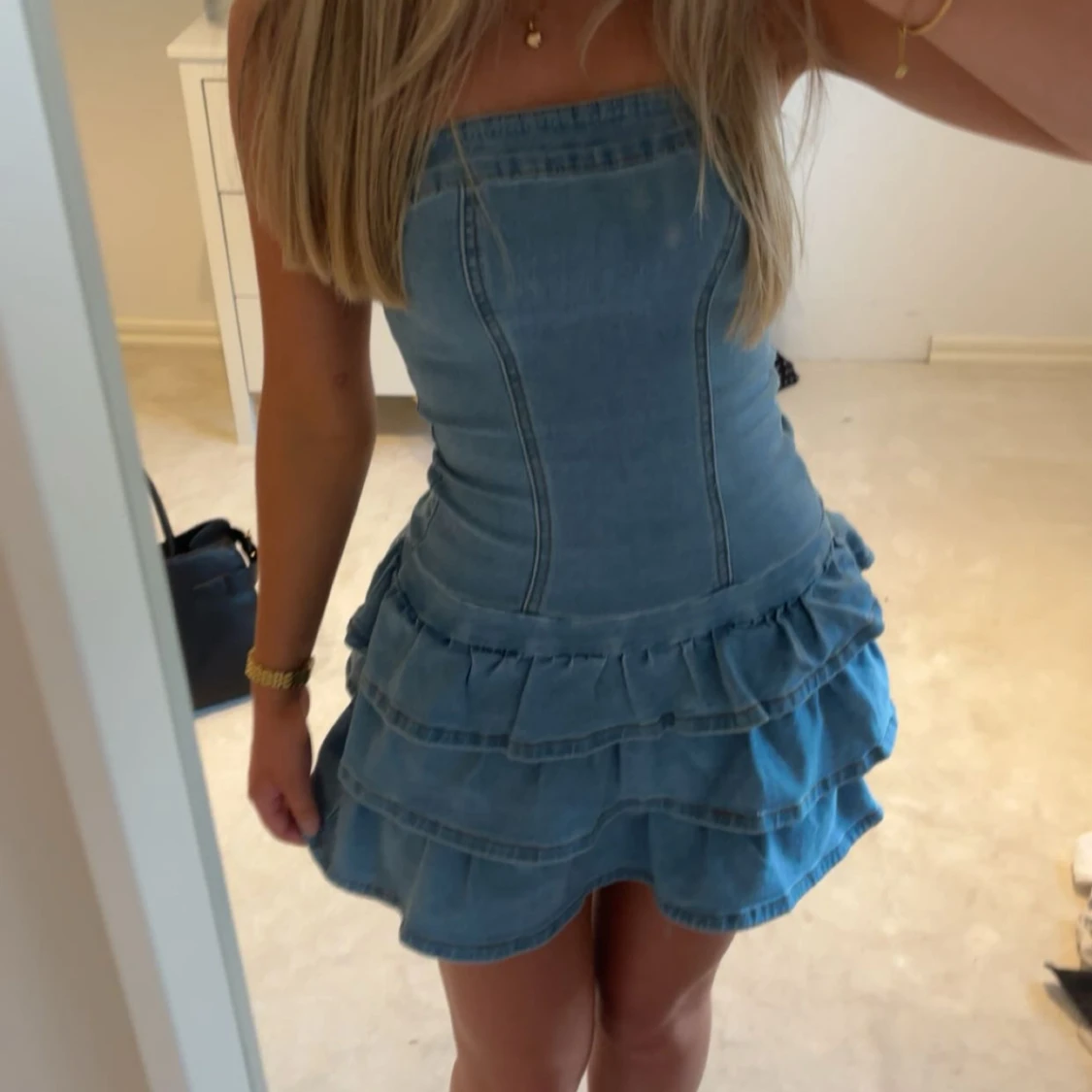 Supersöt axelbandslös jeansklänning i blått med figurnära passform upptill och volanger i flera lager på kjolen. Köpt på Plick men är aldrig använd. Stl XS.