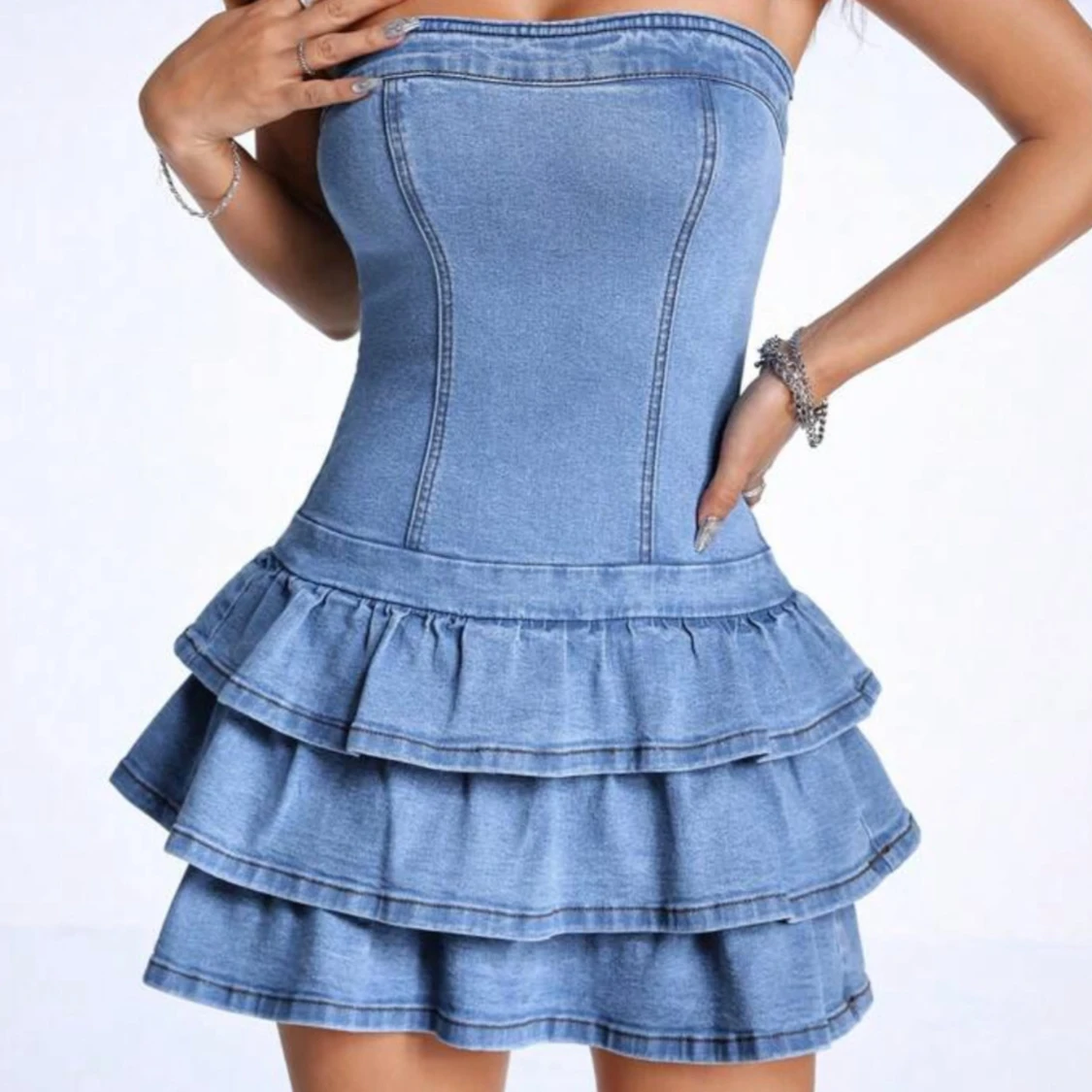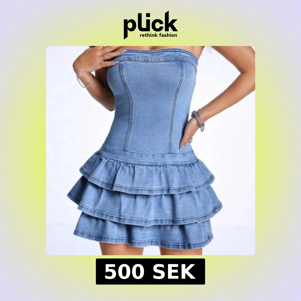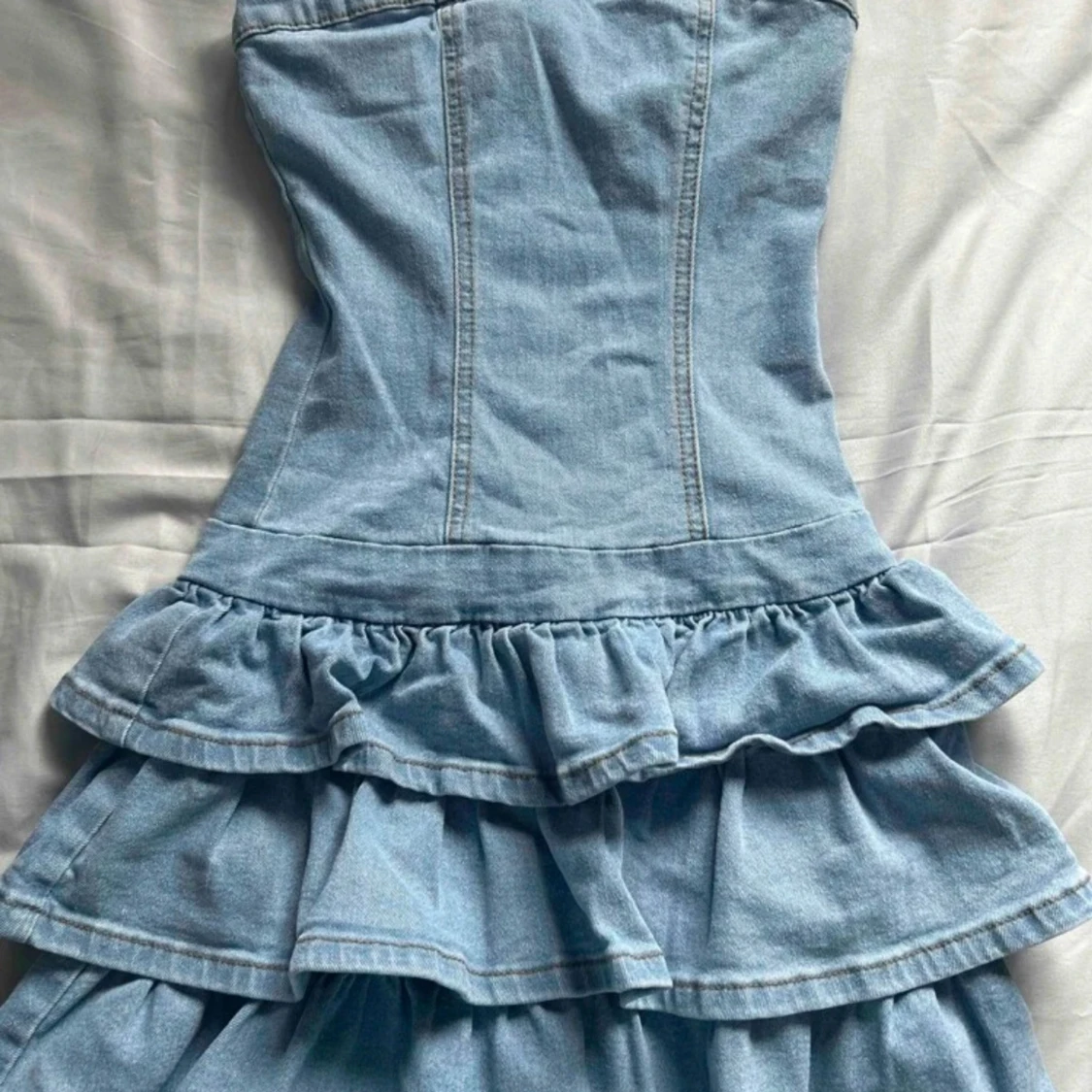 Supersöt jeansklänning i ljusblå denim med axelbandslös design och figurnära passform. Kjolen har flera lager volanger som ger en extra cool och lekfull vibe. Perfekt för dig som gillar att sticka ut och vill ha en trendig look. Klänningen är ärmlös och har en snygg, tight siluett. Köpte för 580 från en tjej på plick💞💞