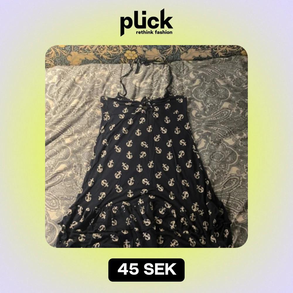 Det är en blå medellång klänning med små ankare på, den är triangelformad upptill och man knyter den runt naken, den har även en volang nertill