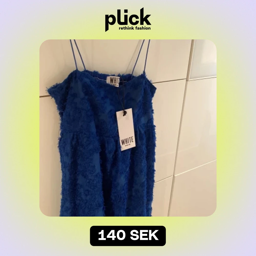 Fin blå klänning från en sales sample av White (lapp kvar, ej använd). Spagettispand med ett fluffigt mönster på. Stl M men passar mig som har S.