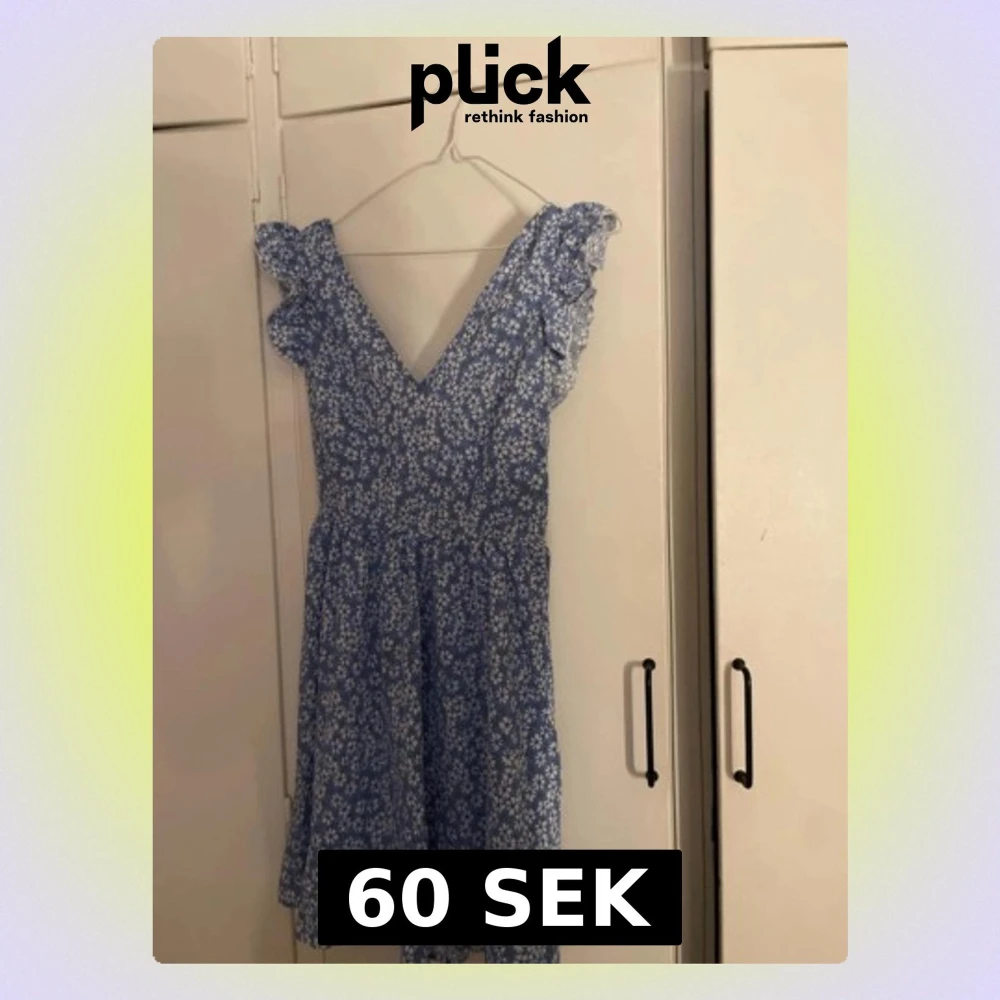 Söt blå klänning med vitt blommönster och volangdetaljer vid axlarna. Klänningen har v-ringad hals och ett knytband i midjan som ger en fin siluett. Perfekt för varma dagar och har en luftig, kort passform.