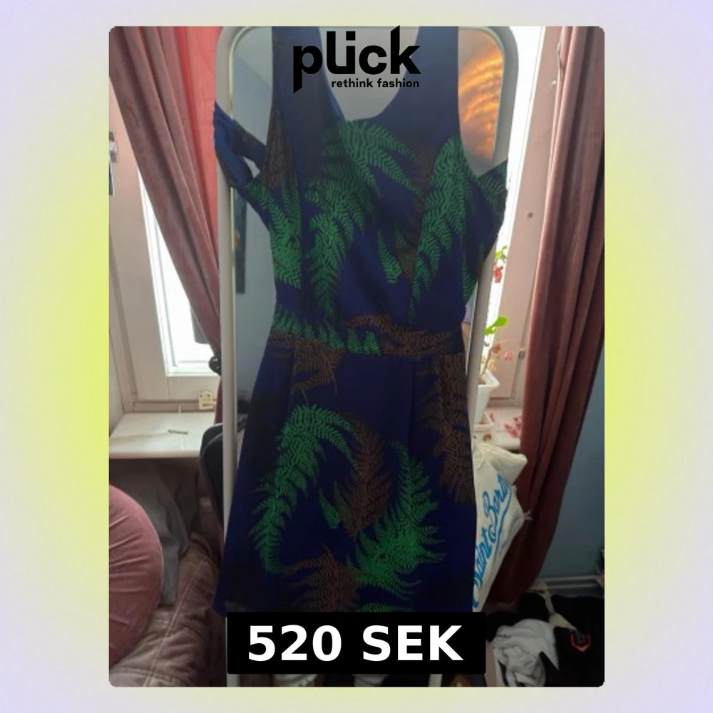 Snygg blå klänning med grönt och brunt ormbunksmönster. Klänningen har breda axelband, markerad midja och lätt utställd kjol. Materialet ser ut att vara ett mjukt, följsamt tyg som ger en skön passform. Perfekt för dig som gillar naturinspirerade prints och färgstarka plagg.