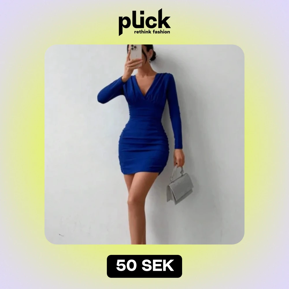 Säljer en snygg blå klänning med v-ringning och långa ärmar. Den är tight och ganska kort, perfekt för festliga tillfällen. Klänningen har en stilren design och är gjord i ett mjukt material som sitter bekvämt på kroppen. Använd 1 gång.