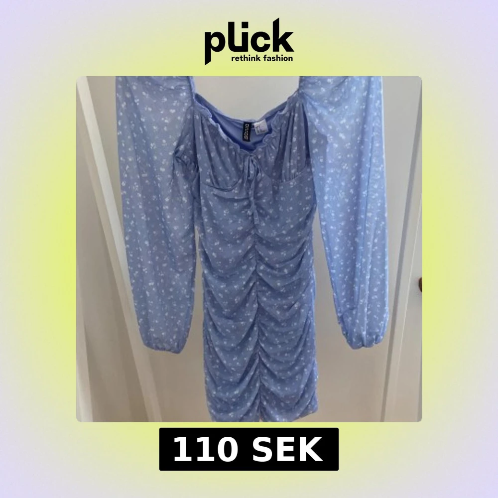 Supersöt ljusblå kortklänning från H&M med små vita blommor, långa puffärmar och rynkade detaljer framtill. Klänningen har knyt vid bysten och är gjord i ett tunt, mesh-liknande syntetmaterial. Tight passform