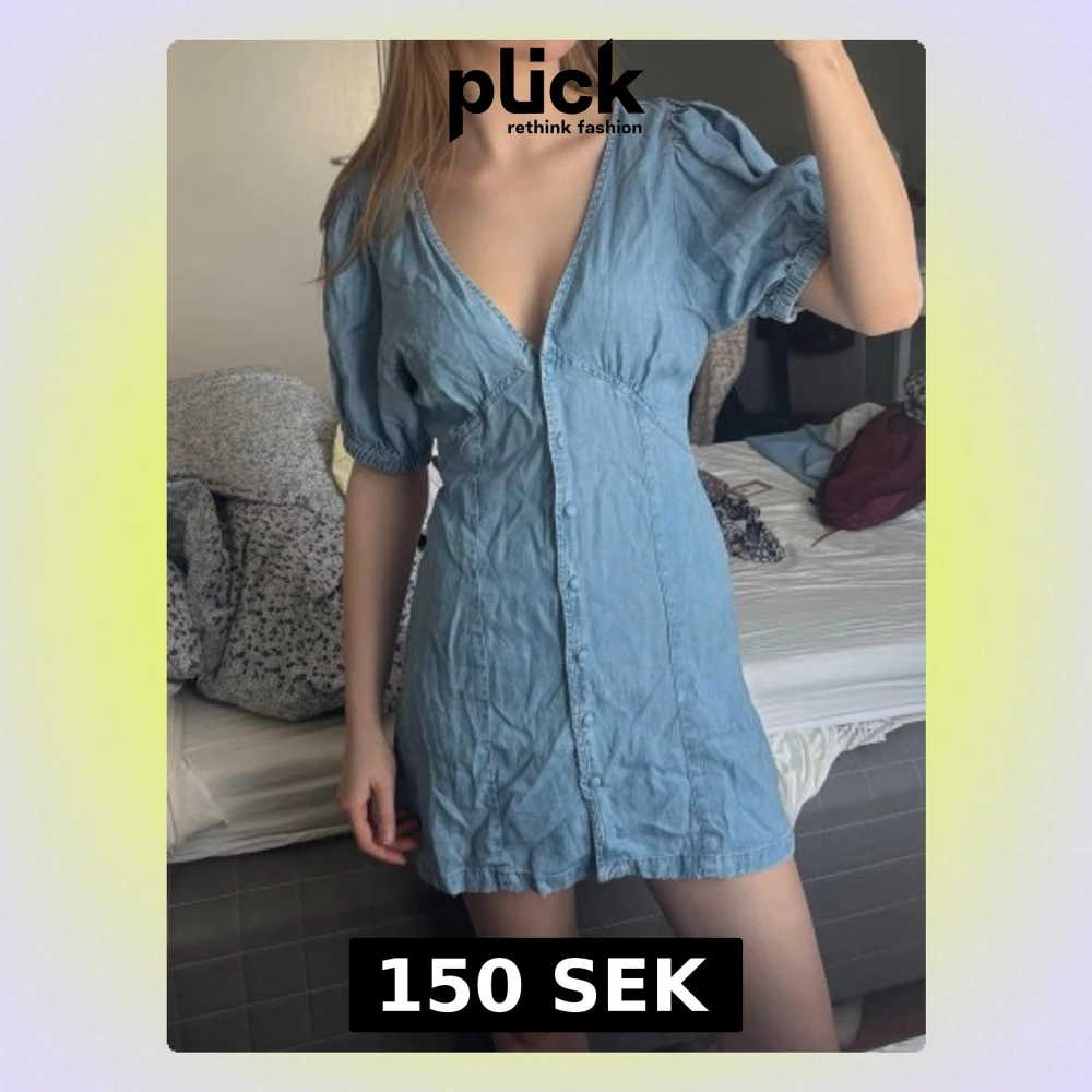 Söt blå kort klänning från Asos design i jeans med v-ringning, puffärmar och knappar framtill.