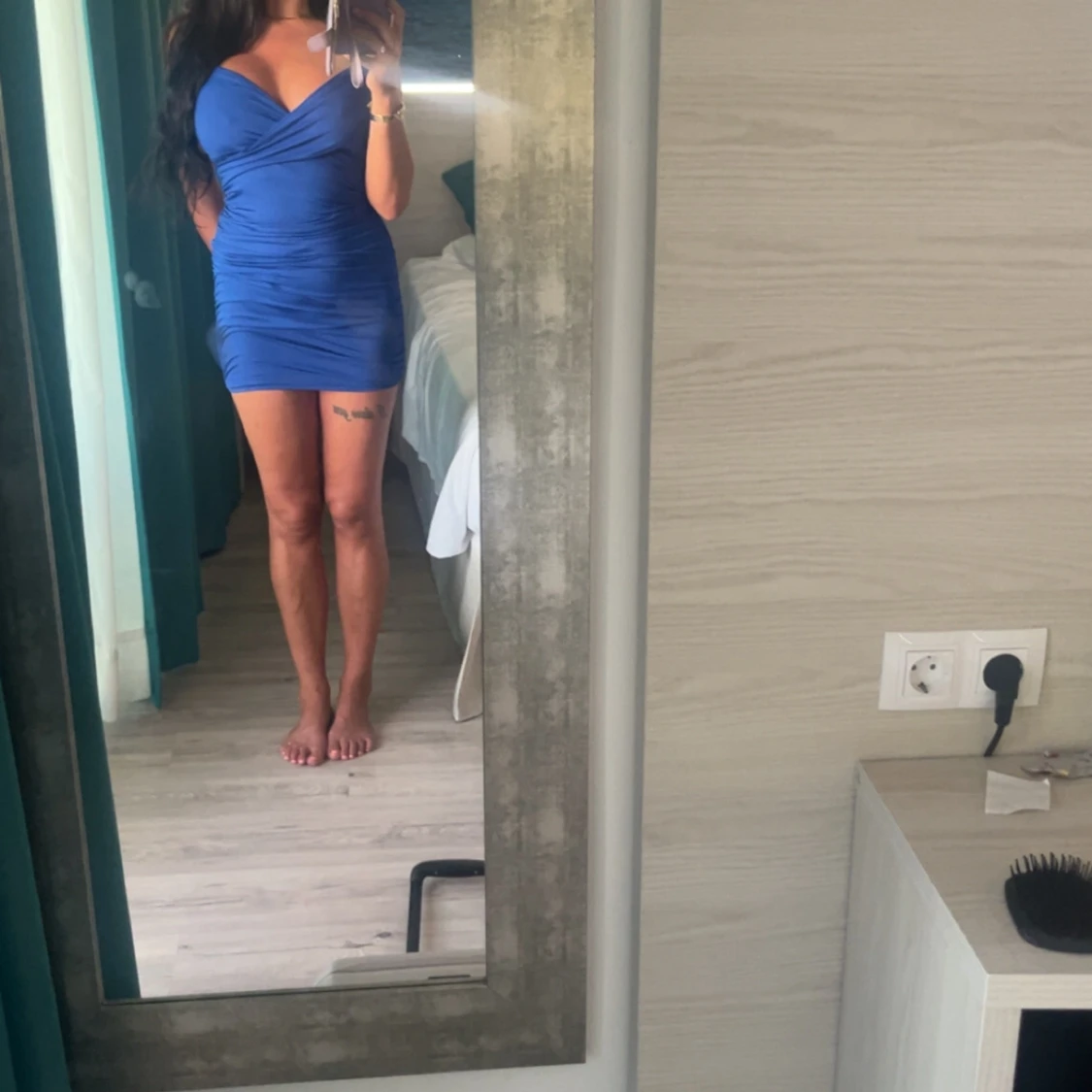 Säljer en snygg blå kortklänning med omlott-detalj och v-ringad hals. Klänningen har en tight passform och är ärmlös, perfekt för dig som vill ha en stilren och trendig look. Passar dig som gillar att sticka ut med färg och form.