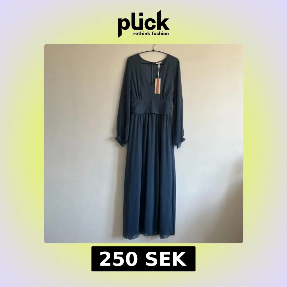Elegant blå långklänning med långa ärmar och ett brett midjeband. Klänningen har en dragkedja i ryggen och ett knytband för extra detalj. Klänningen har aldrig använts och är i nyskick.
