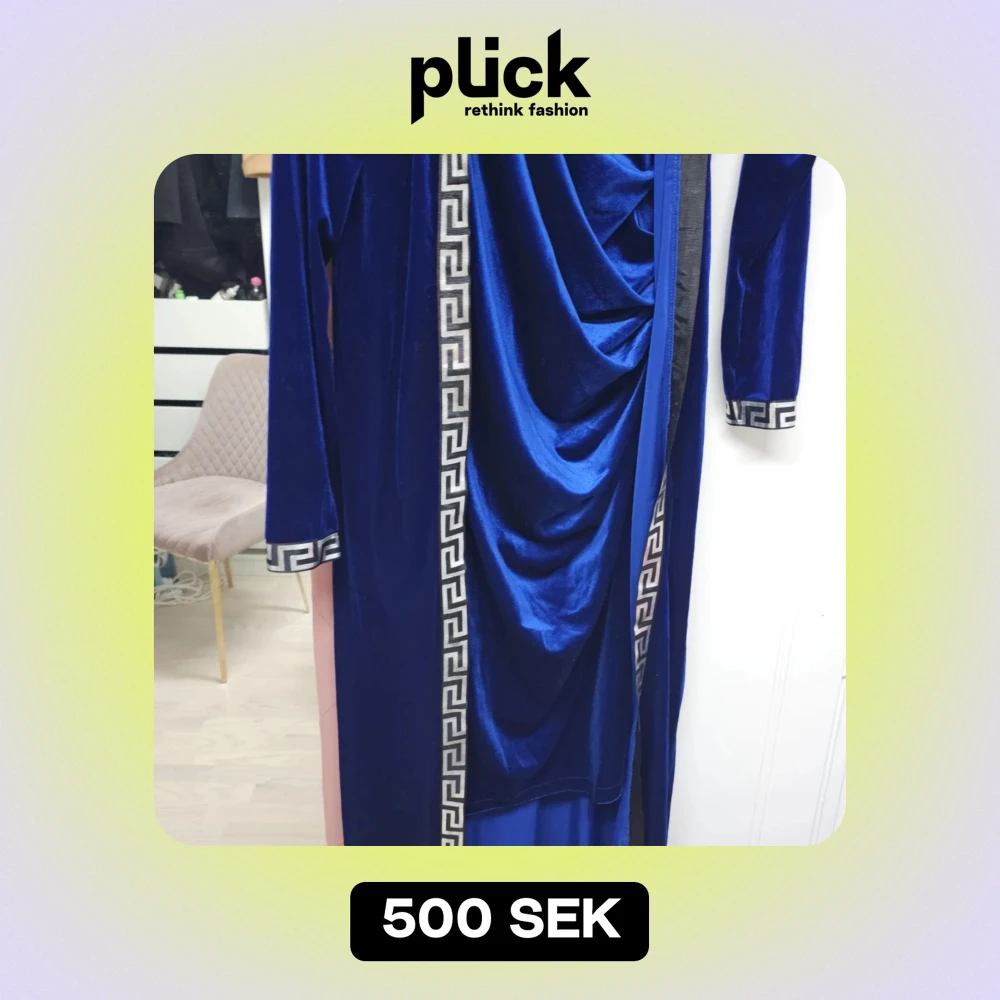 Elegant blå långklänning i sammet med grekiskt mönster längs kanterna och ett stort dekorativt motiv på ryggen. Klänningen har långa ärmar och en draperad framsida som ger en lyxig känsla.