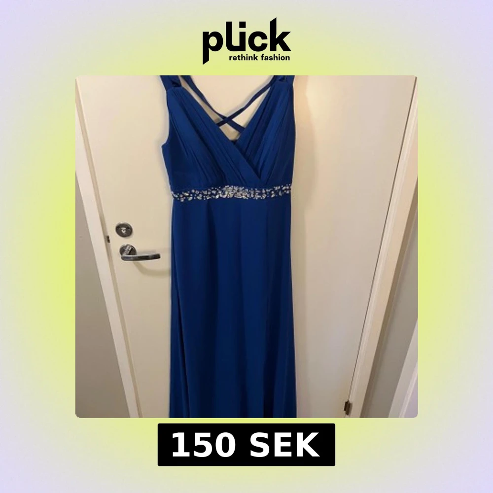 Säljer en elegant blå långklänning med v-ringad omlott framtill och korsade axelband i ryggen. Klänningen har pärldetaljer i midjan och dragkedja bak. Perfekt för bal eller festliga tillfällen. Alla lappar kvar! Aldrig använd.