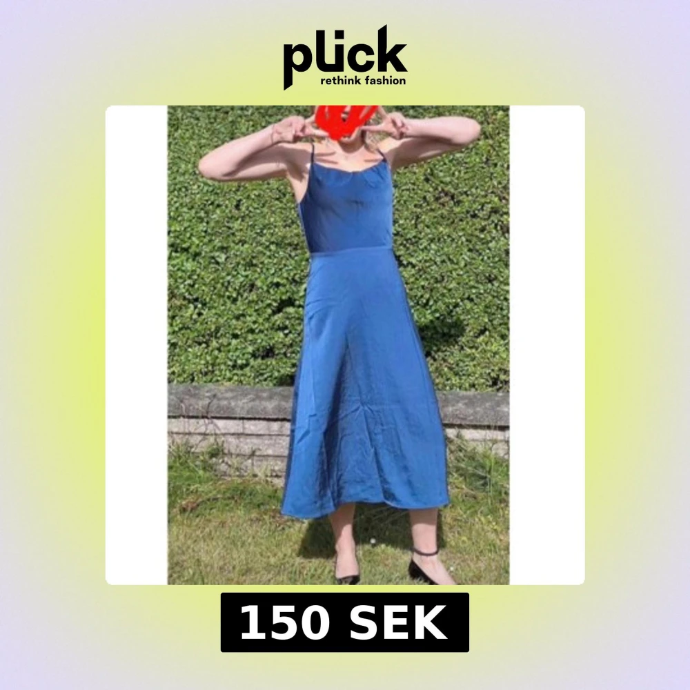 Snygg blå långklänning med smala axelband och lätt utställd passform. Klänningen har en enkel och stilren design som ger en elegant siluett. Materialet är mjukt och har ett lätt glansigt utseende, perfekt för varmare dagar. Behövs du lite på ena axelbandet. Över det är den som ny