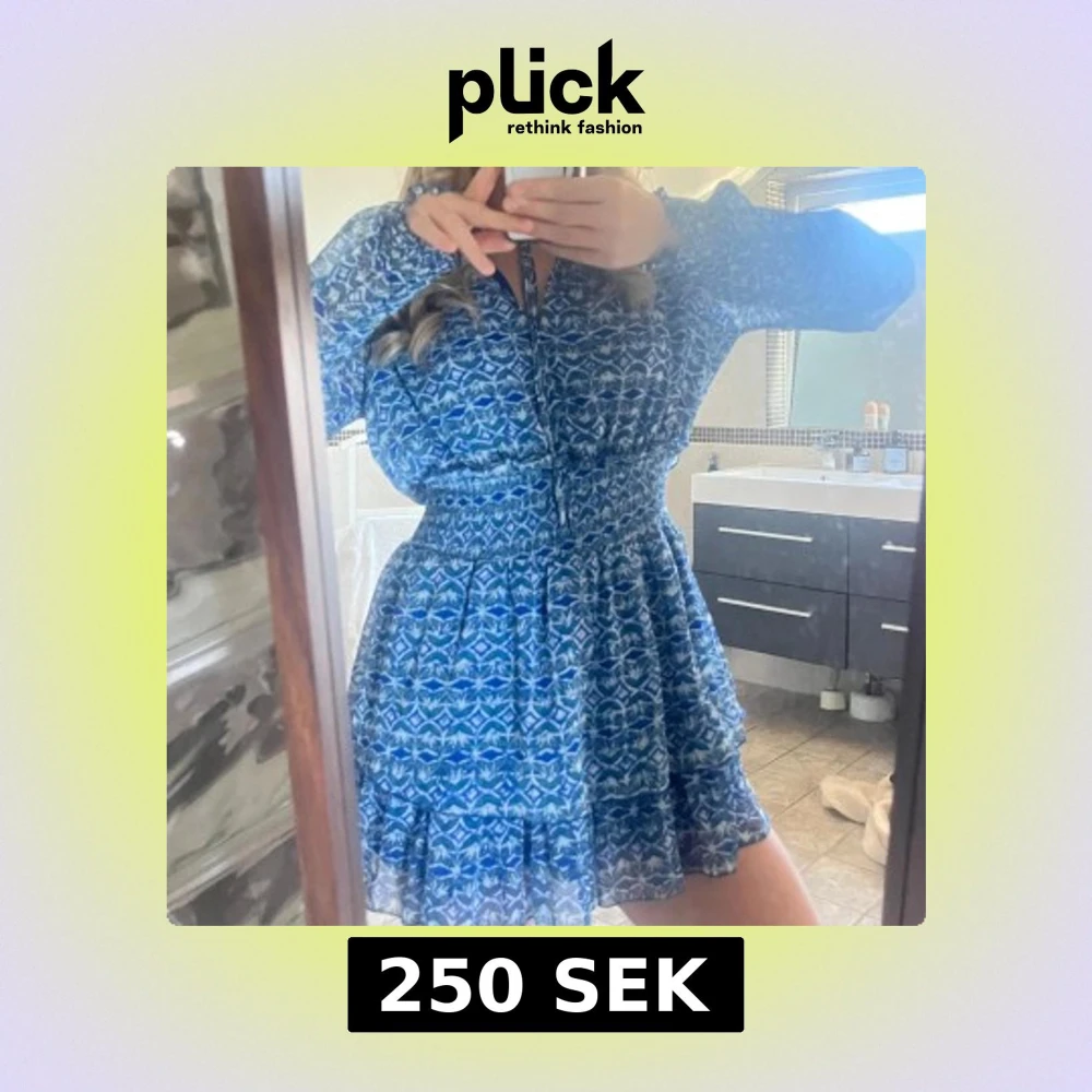 Säljer en blå mönstrad klänning med långa ärmar och volangdetaljer. Klänningen har en smickrande passform med markerad midja och ett vackert mönster i olika blå nyanser. Perfekt för både vardag och speciella tillfällen!!❣️