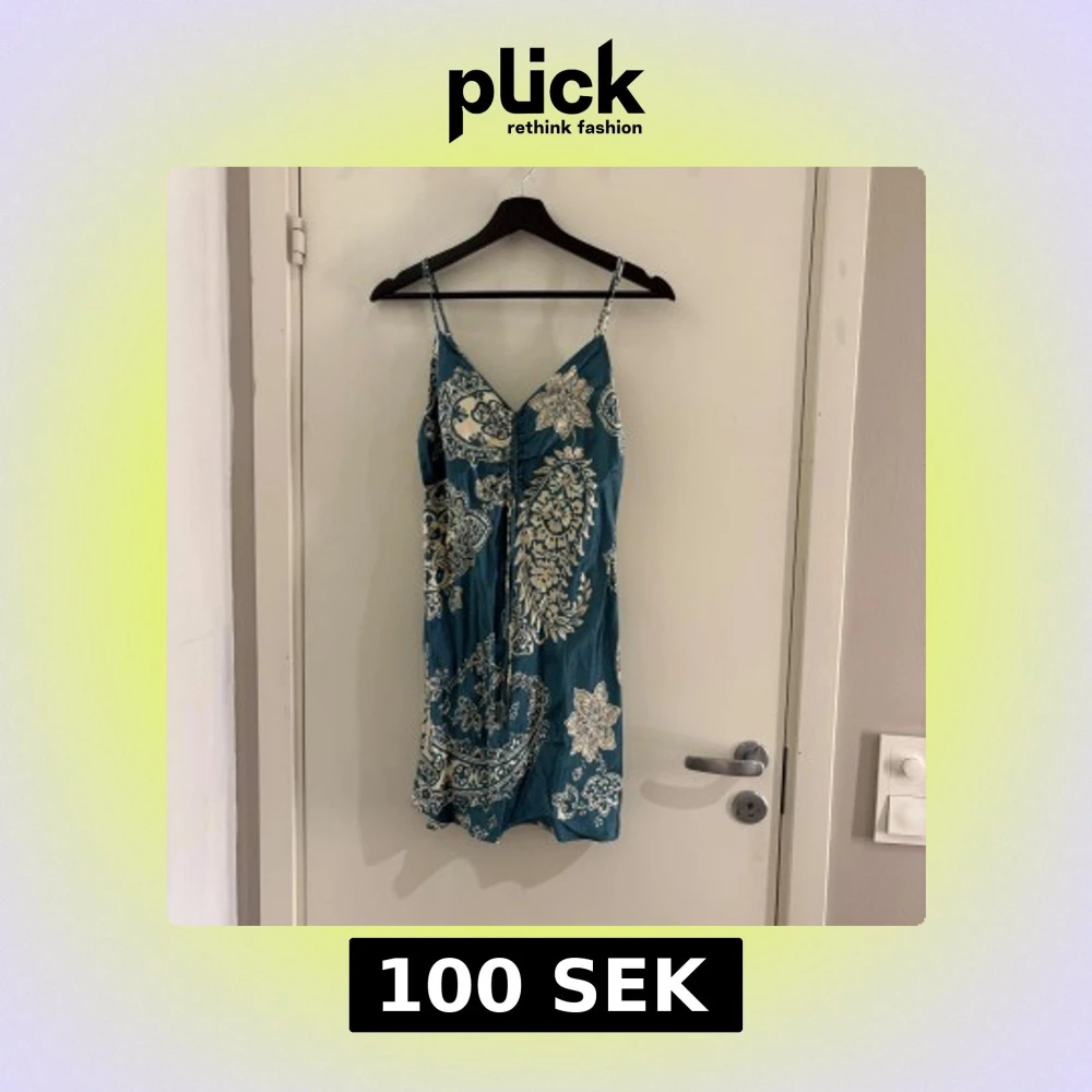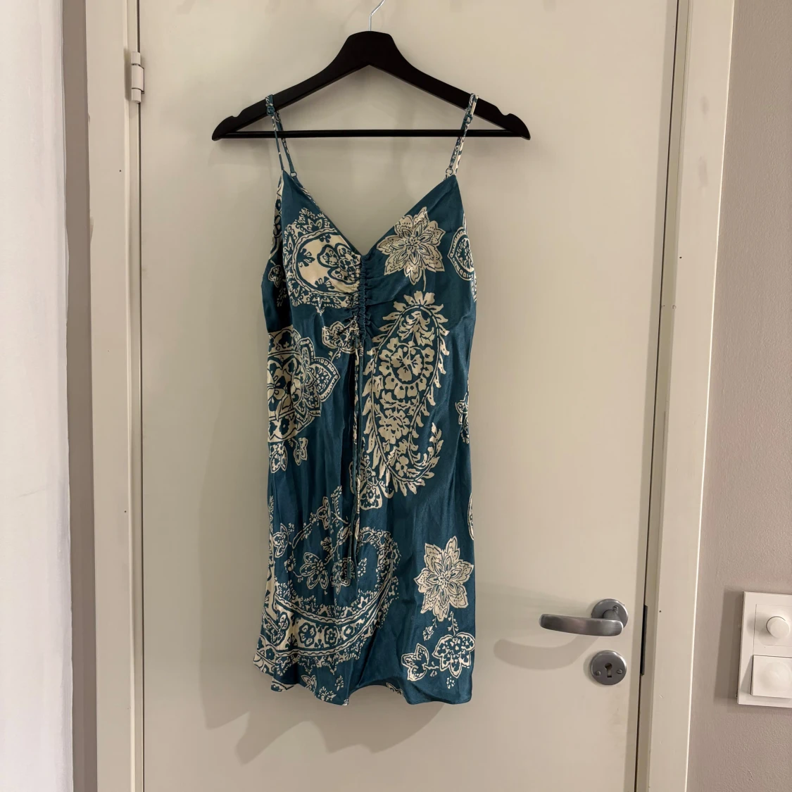 Snygg blå klänning med vita mönster och smala axelband. Perfekt för sommarens varma dagar. Den har en v-ringad design som ger en elegant touch.
