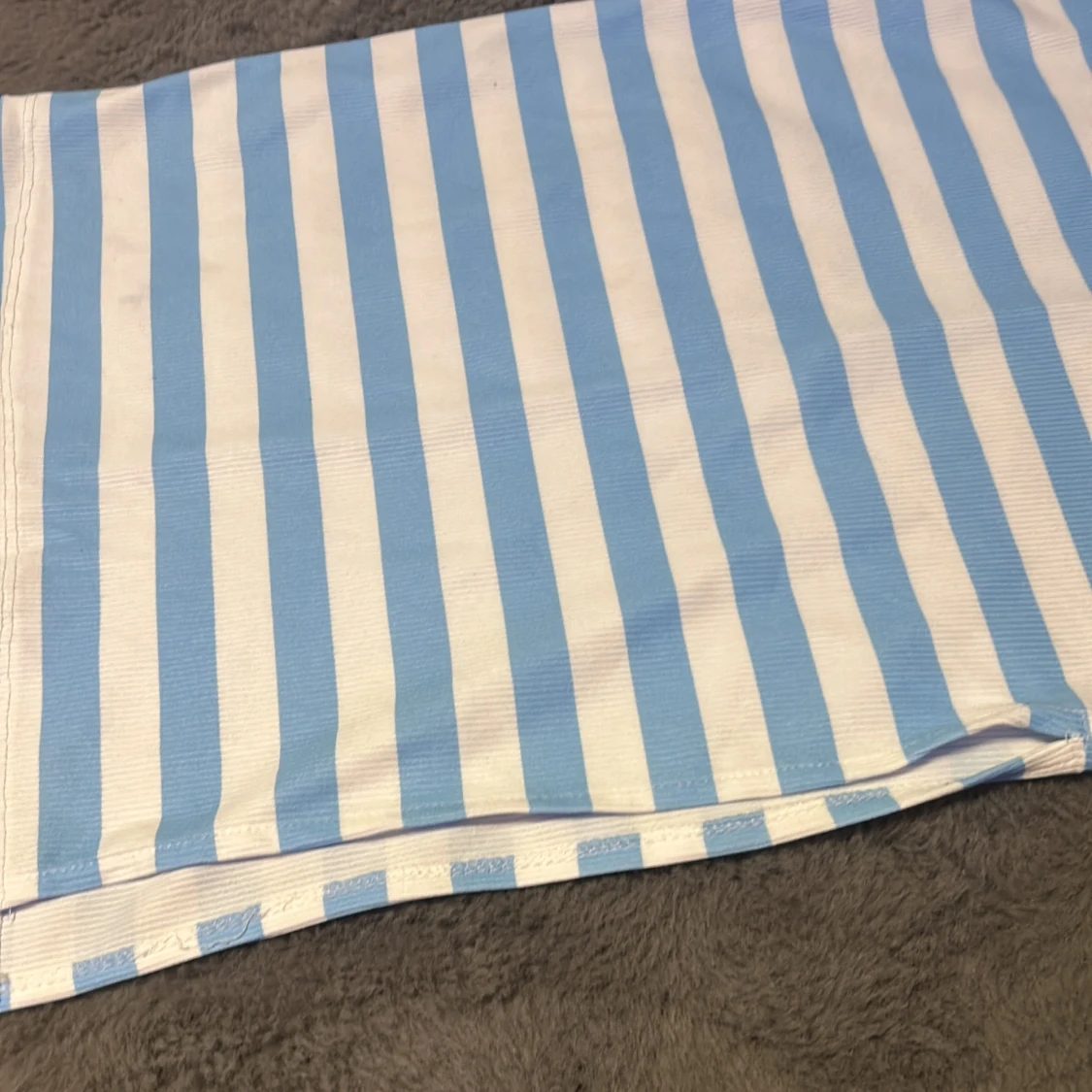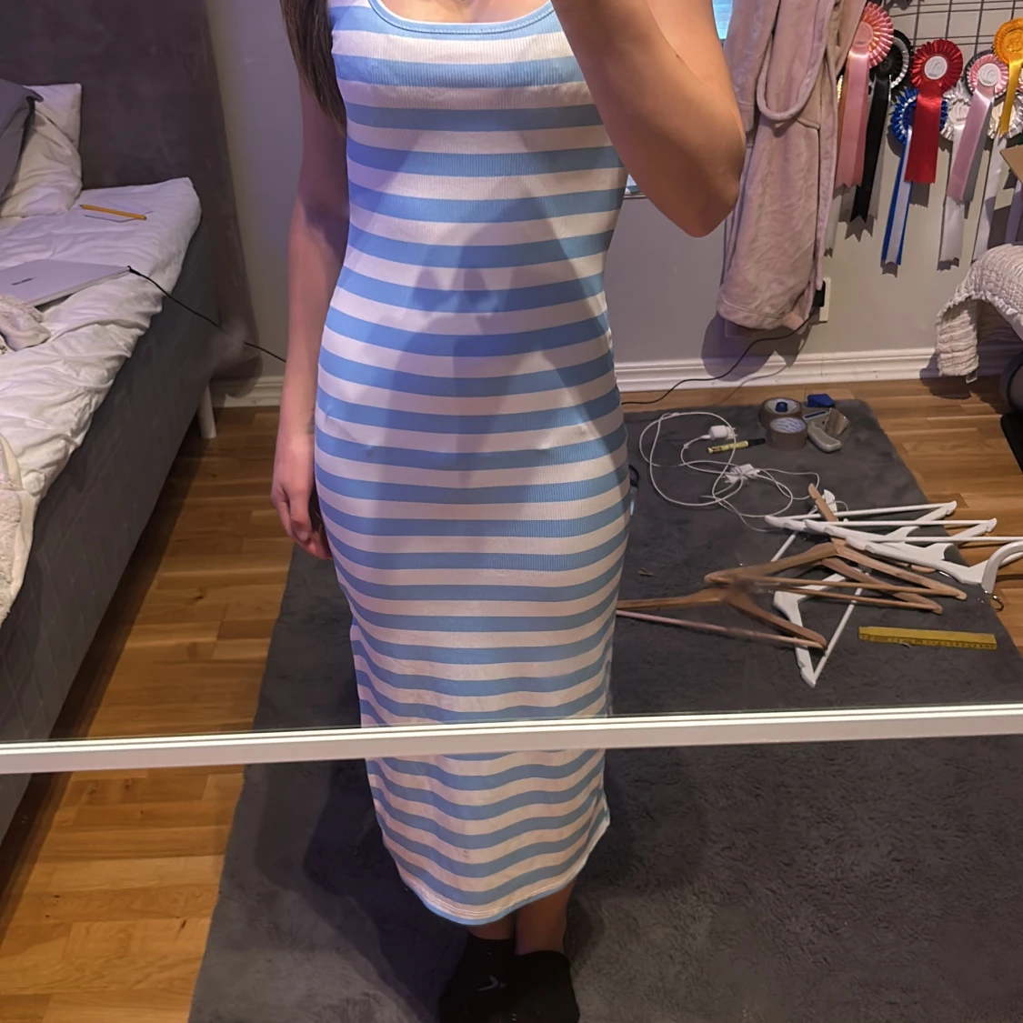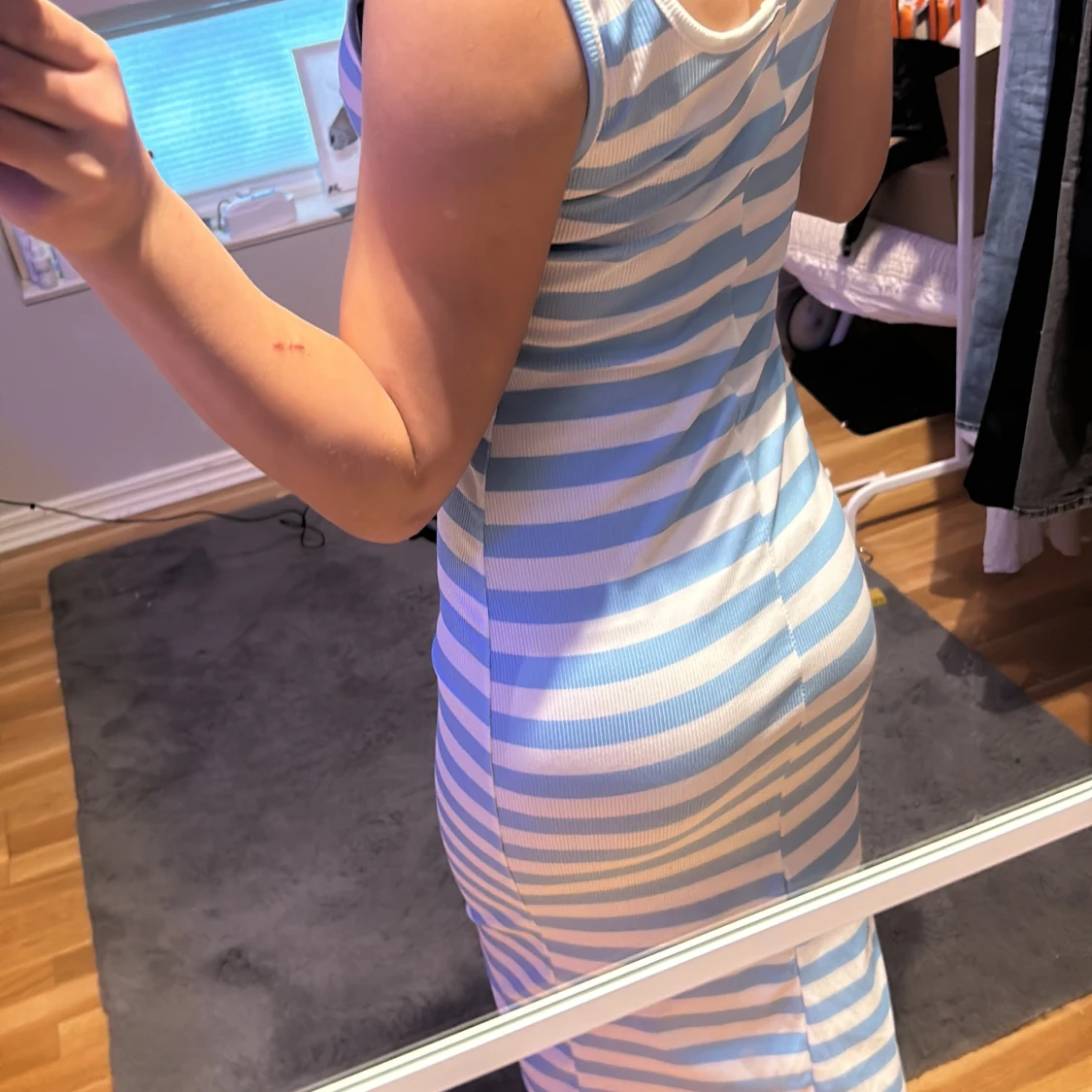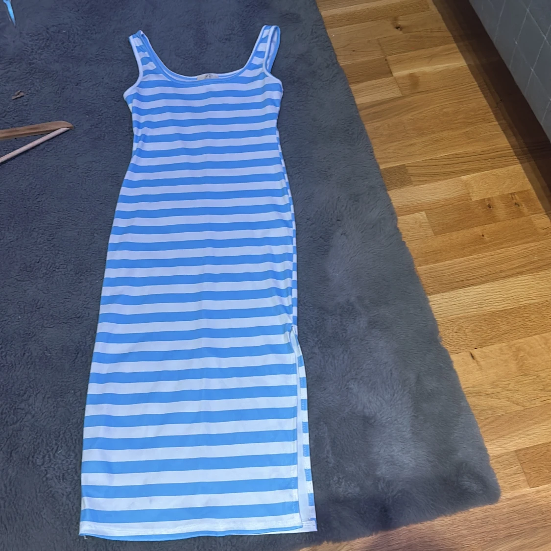 Säljer en snygg blå- och vitrandig klänning med en tight passform. Klänningen är ärmlös och har en slits på sidan. Perfekt för sommarens varma dagar. Den är gjord i ett ribbat material som ger en skön känsla.