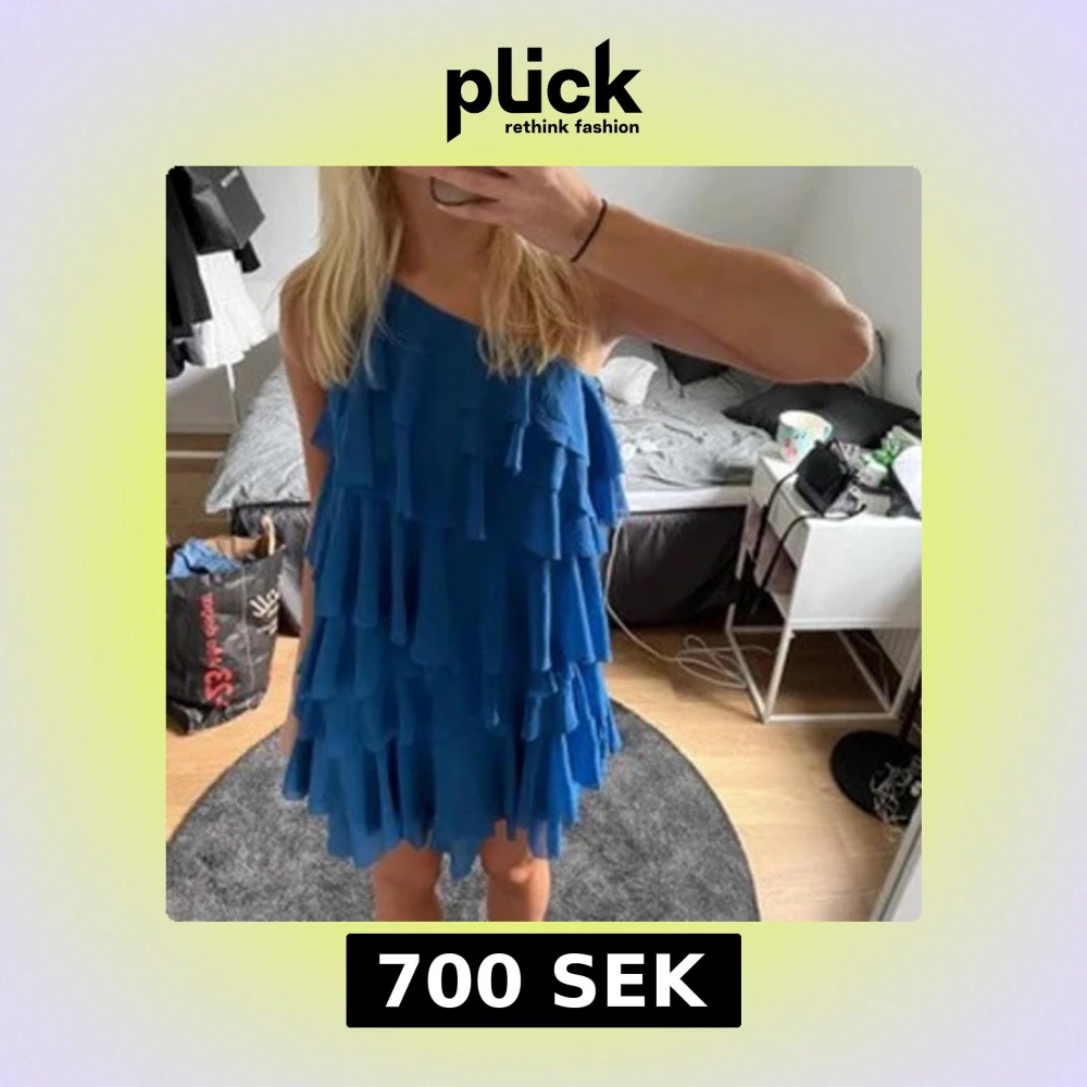 Säljer en blå kortklänning med flera lager volanger och oneshoulder-design. Klänningen har en loose passform och är perfekt för dig som gillar att sticka ut med en cool och trendig look. Materialet känns lätt och luftigt, vilket gör den skön att bära under varma dagar.
