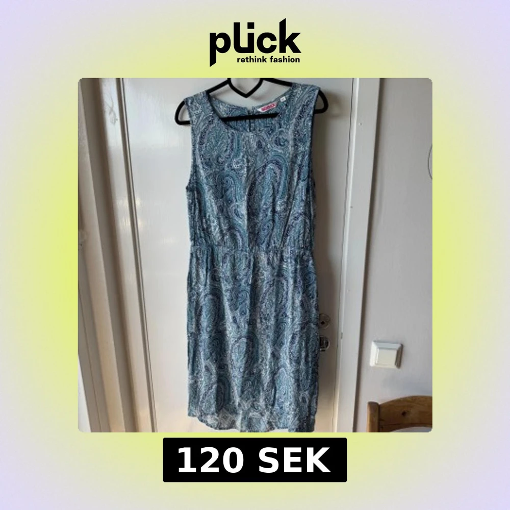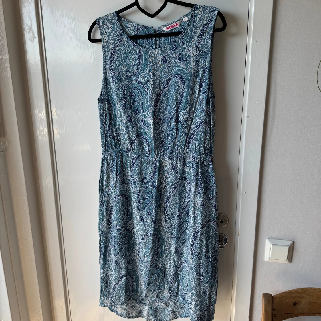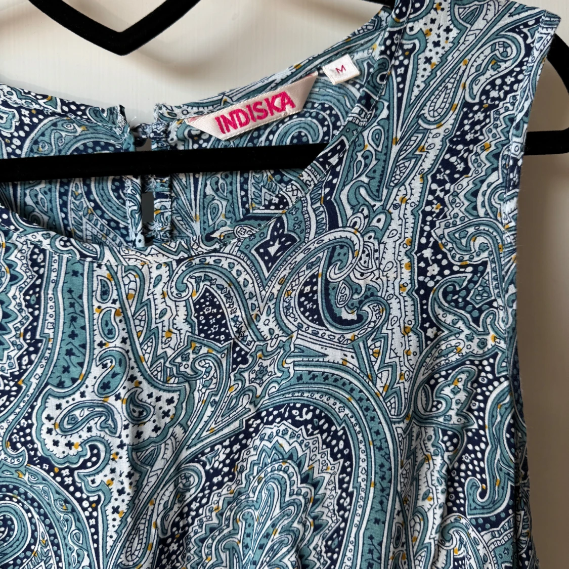 Snygg blå paisleymönstrad klänning från Indiska i storlek M. Klänningen är ärmlös med rund halsringning och har en avslappnad passform med resår i midjan. Materialet känns lätt och luftigt, perfekt för varma dagar. Paisley-mönstret ger en bohemisk vibe.