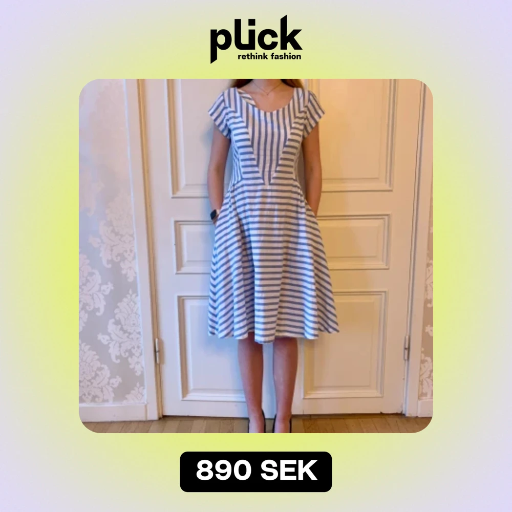 Jättefin blå vit randig klänning i skönt material. Storlek 38. Med fickor! Modellen på bilden är 173 cm och har storlek 38 i de flesta andra kläder. Aldrig använd. Vi har lagt ner vår klänningsbutik och säljer ut. Ny pris är 2000-3000kr