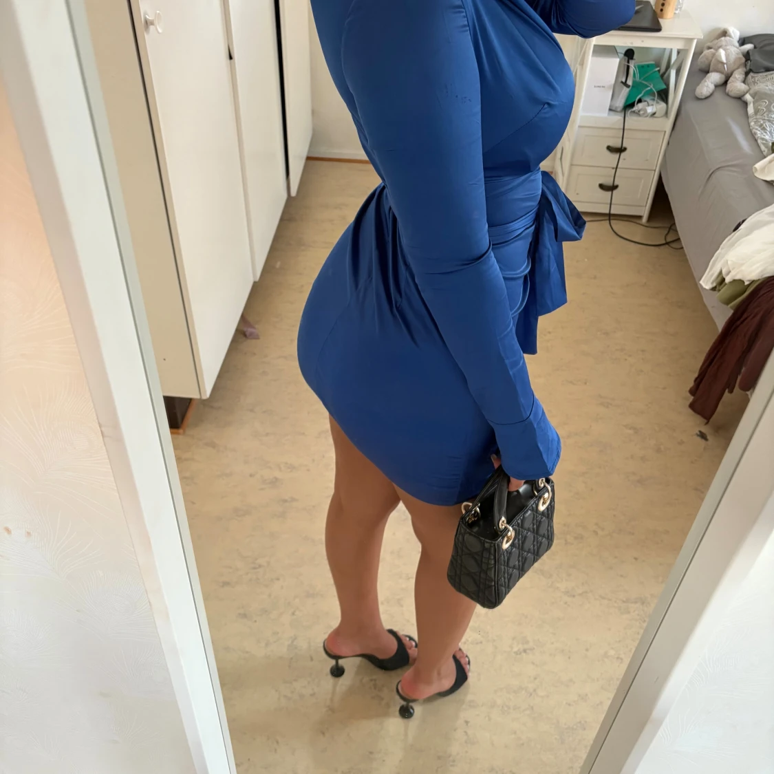 Supersnygg blå kortklänning i satin med djup v-ringning, långa ärmar och knyt i midjan. Klänningen har en figurnära passform och coola draperade detaljer framtill. Perfekt för dig som vill sticka ut och känna dig extra glam.