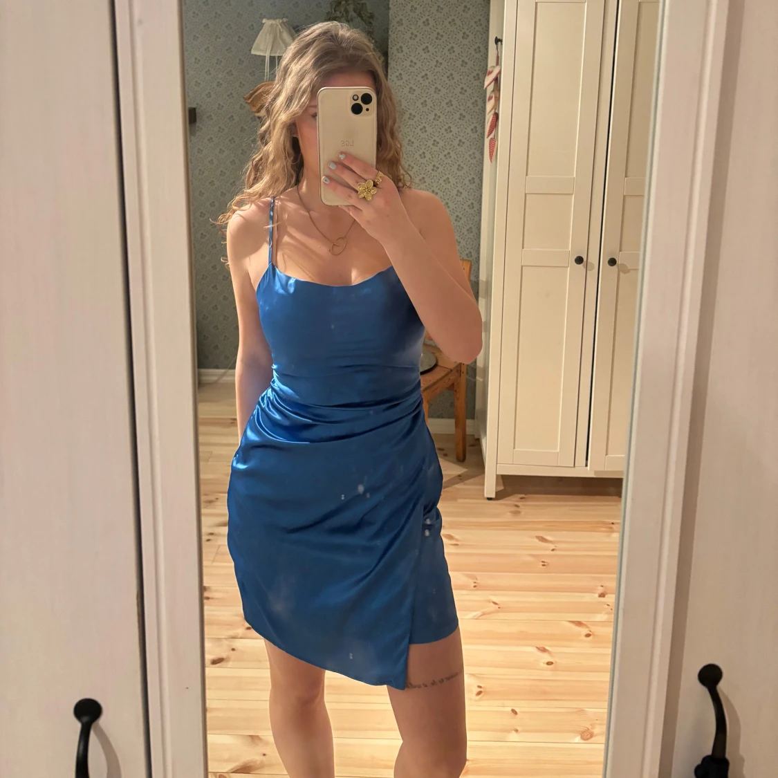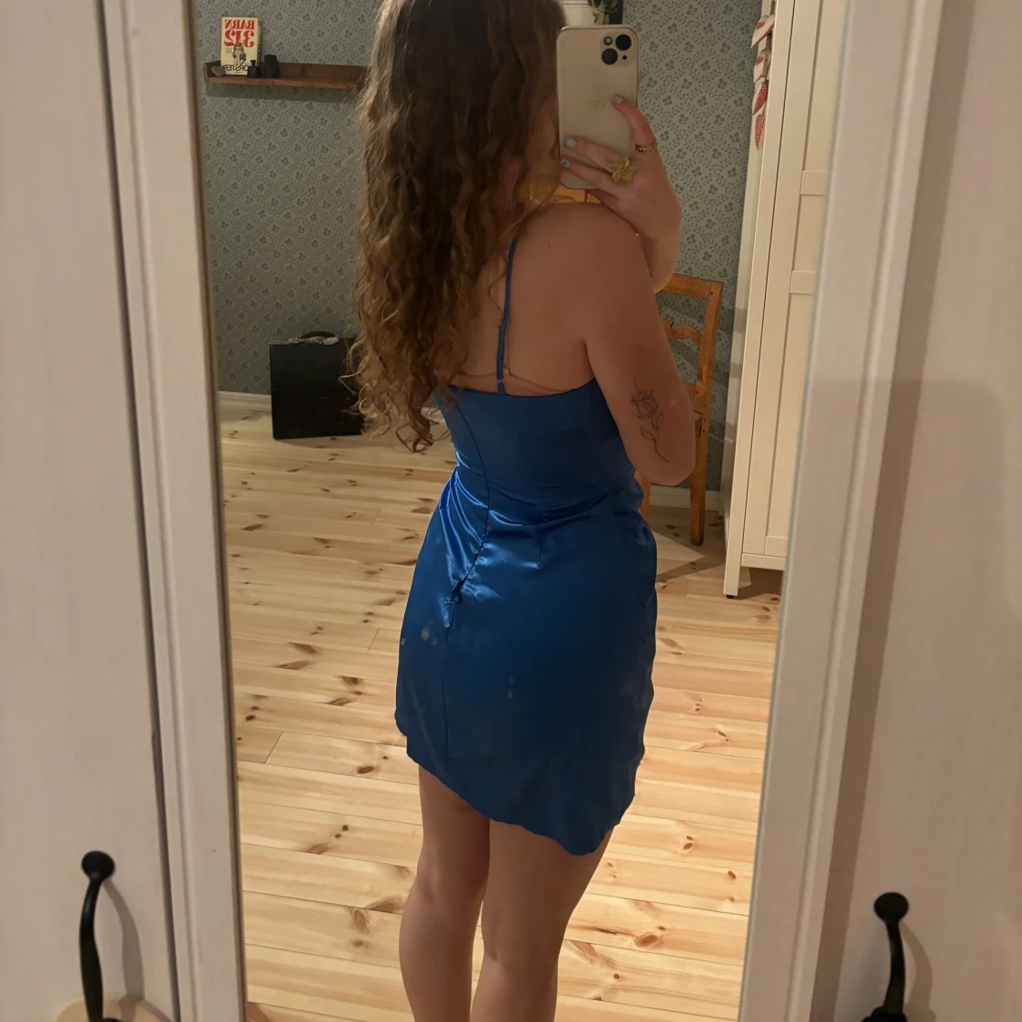 Wow vilken klänning! Sitter som en smäck och är dessutom väldigt bekväm. Man behöver inte ha bh under även om man har större byst som jag. Använd en gång och därför i bra skick! Dragkedjan där bak har en liten bristning men man kan fortfarande dra upp den utan problem.
