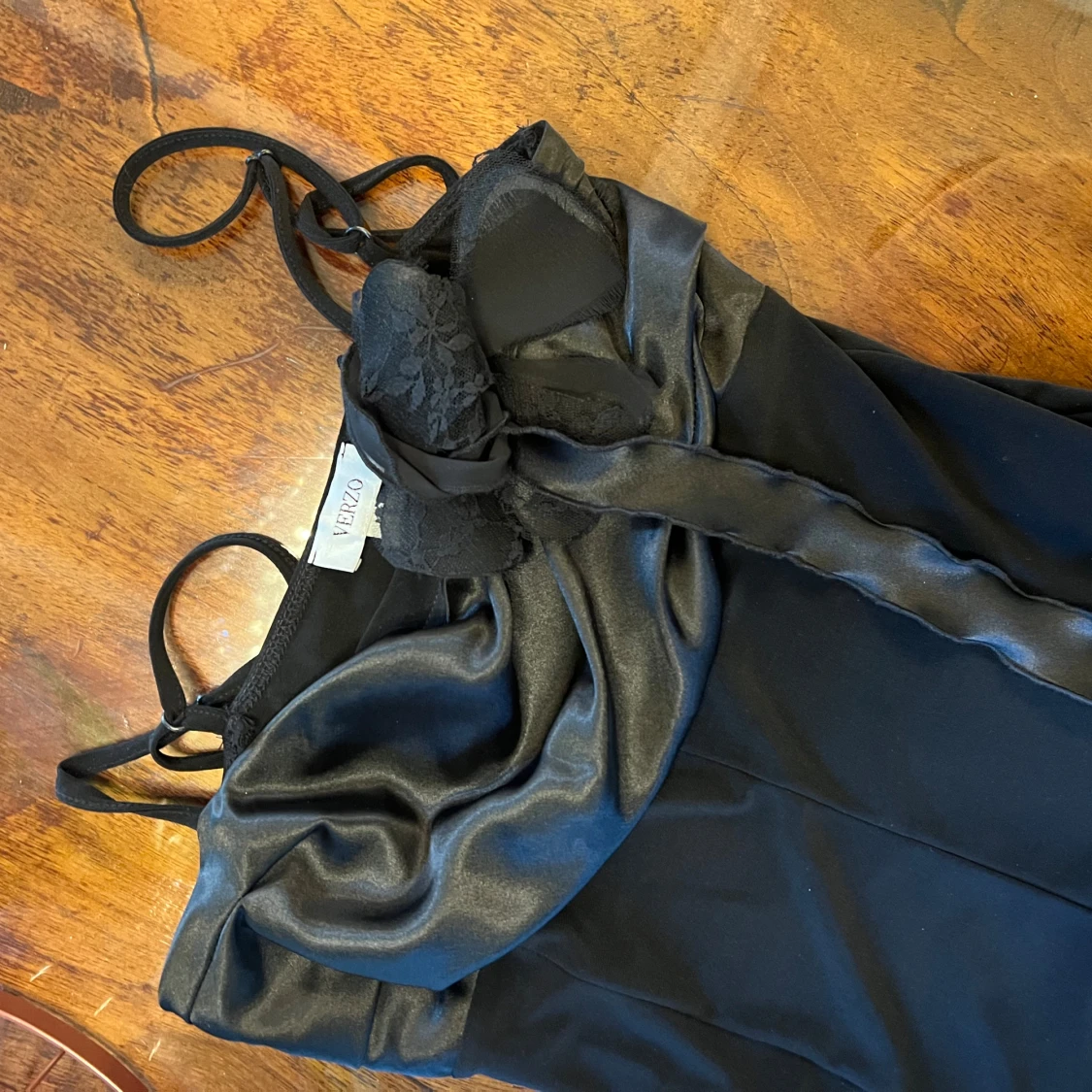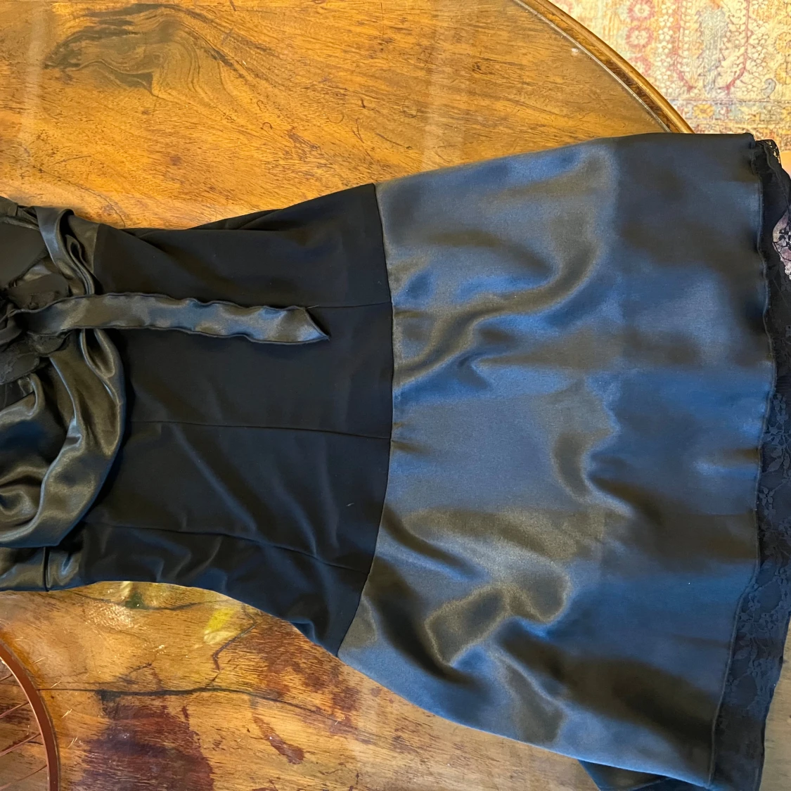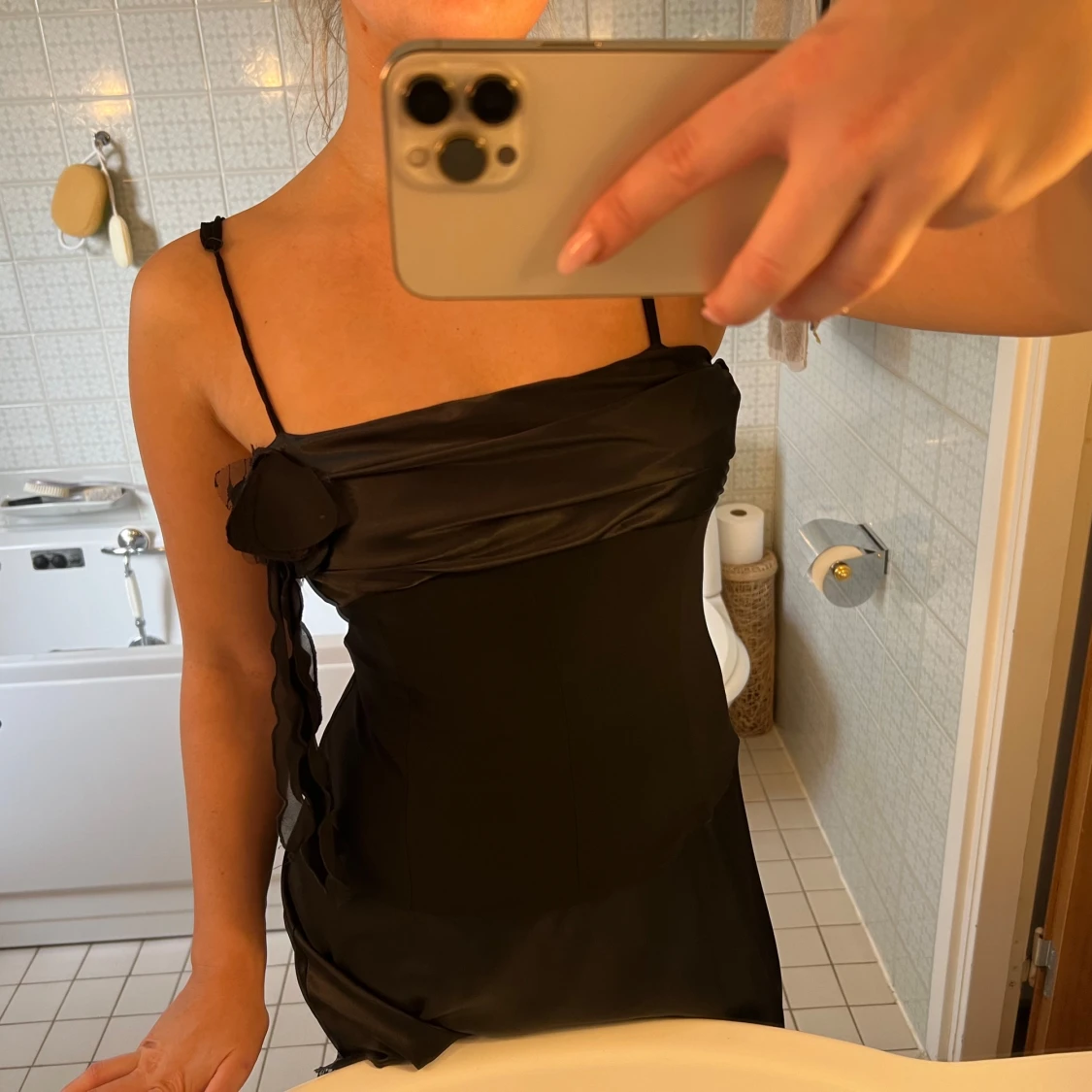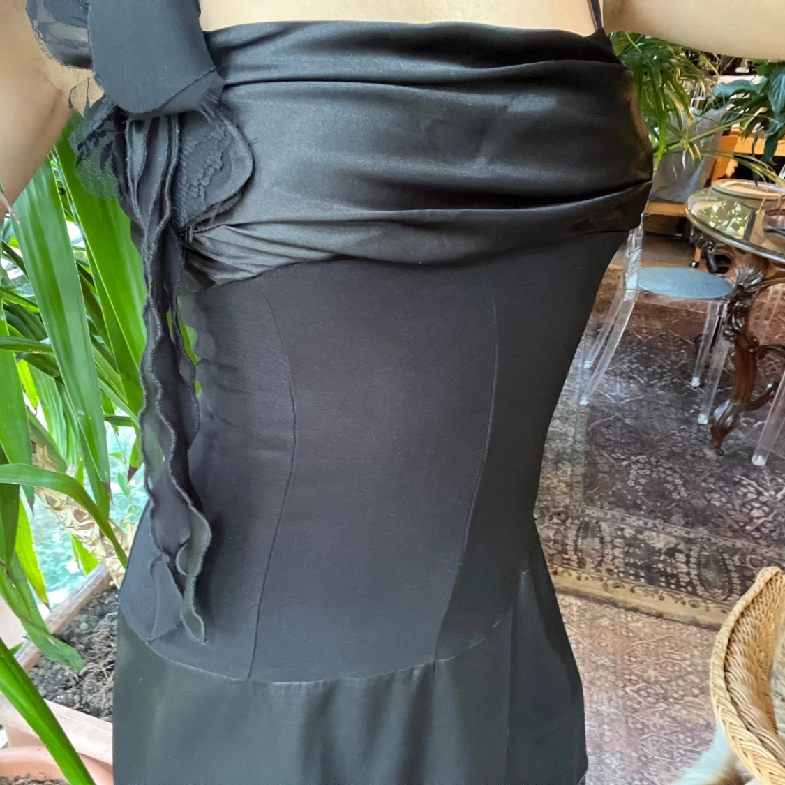 Svart klänning, satin blomma