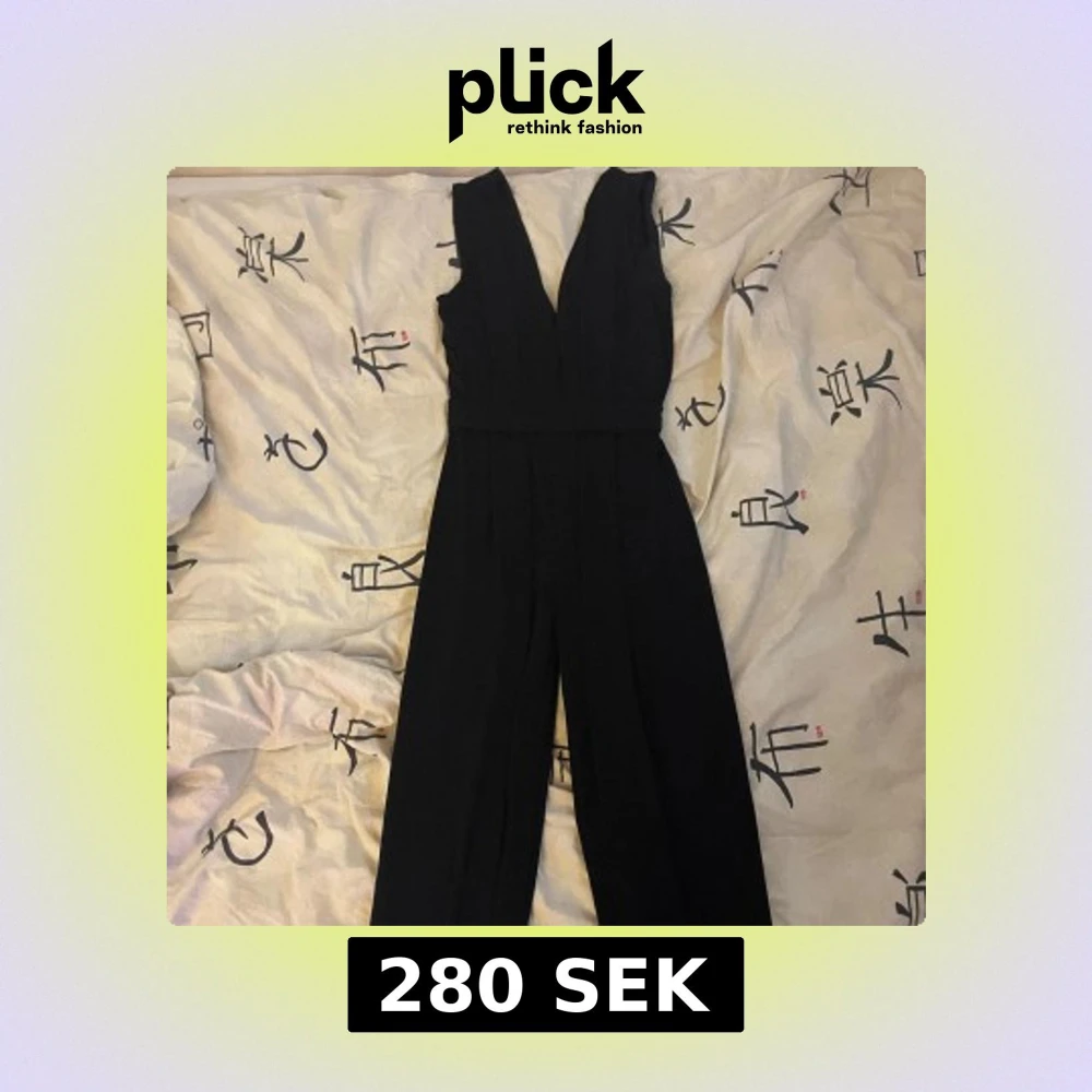 Säljer en svart byxdress med djup v-ringning och breda axelband. Byxdressen har vida ben och markerad midja för en snygg siluett. Perfekt för dig som vill ha en stilren och trendig look.