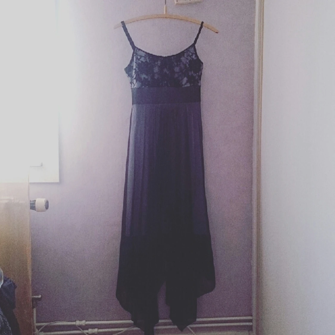 Tjusig svepande klänning med ljuslila undertyg och svart, draperad mesh som ytterkjol samt svart spets i toppen. Använd en gång. Passar dig som gillar att verka mystisk.