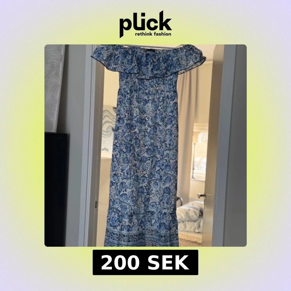 Charmig blåvit långklänning med blommigt mönster och volangdetalj vid axlarna. Perfekt för somriga dagar med sin luftiga design och offshoulder-stil.