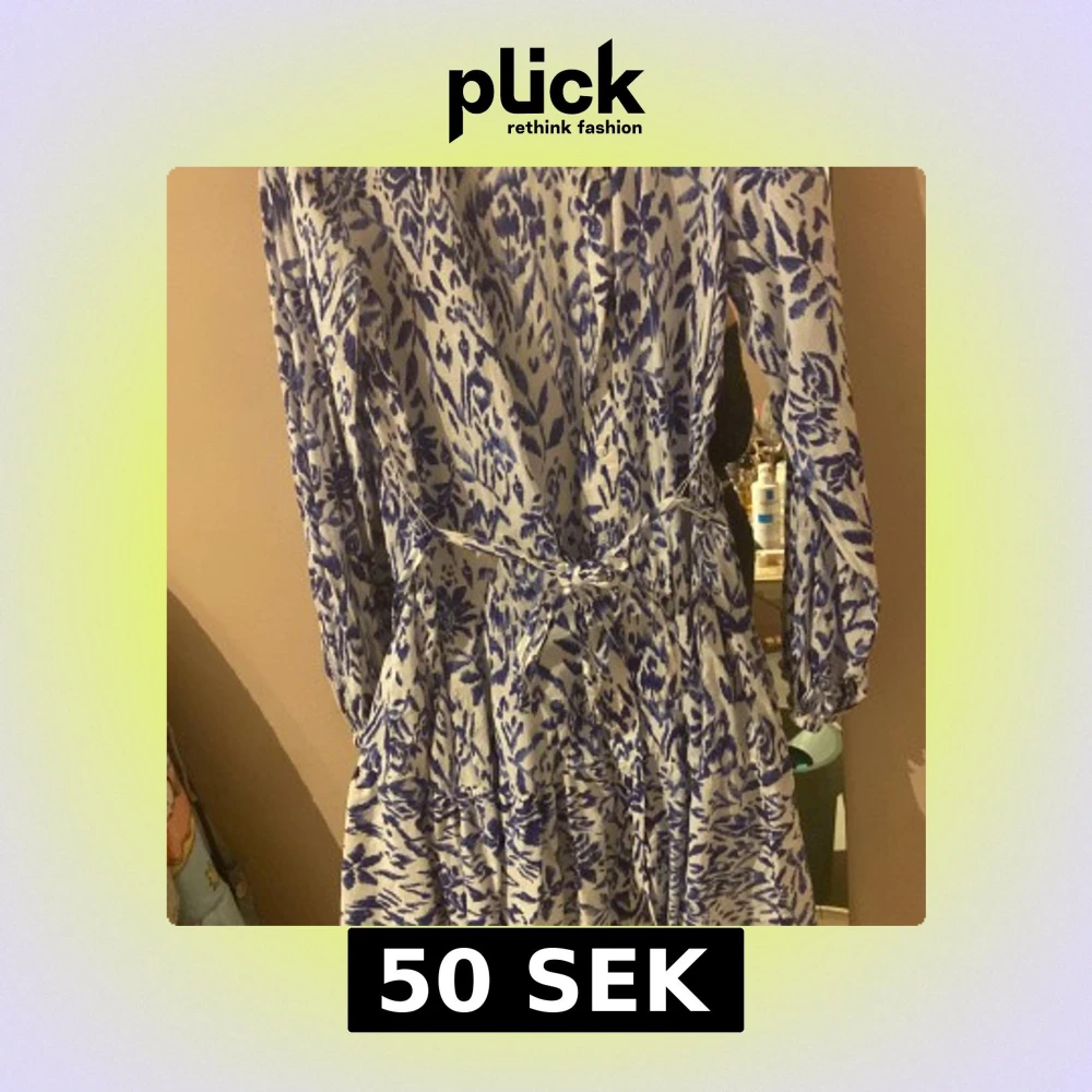 Säljer en blåvit långklänning med blommigt mönster och knyt i midjan. Klänningen har långa ärmar och v-ringning med knappar framtill. Perfekt för dig som gillar bohemisk stil och vill sticka ut med ett unikt print.