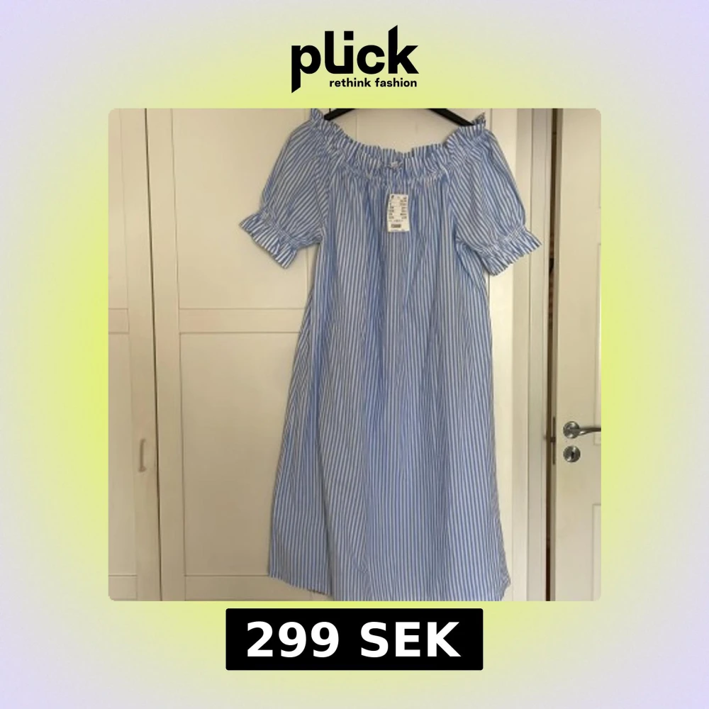 Helt ny med prislapp kvar! Superfin blåvit randig klänning från H&M i offshoulder-modell. Klänningen har korta puffärmar med resår och en luftig, rak passform. Perfekt för varma dagar och ger en fräsch sommarkänsla. Tillverkad i mjuk bomull för extra komfort.